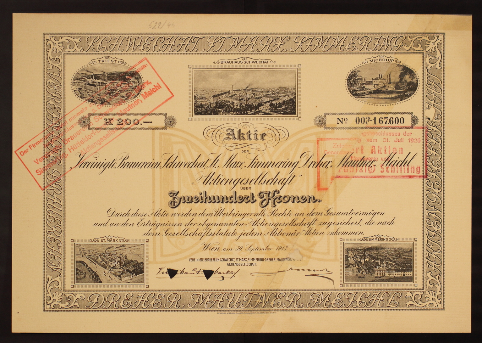 Aktie der Vereinigte Brauereien Schwechat, St. Marx, Simmering, Dreher, Mautner, Meichl Aktiengesellschaft über Zweihundert Kronen. Durch diese Aktie werden dem Überbringer alle Rechte an dem Gesamtvermögen und an den Erträgnissen der obgenannten Aktiengesellschaft zugesichert, die nach dem Gesellschaftsstatute jedem Aktionär Aktien zukommen.