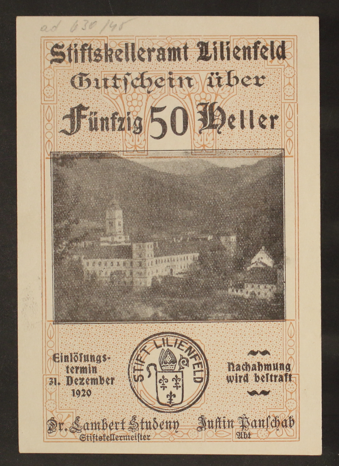 Notgeldschein aus Lilienfeld à 50 Heller, mit Abbildung des Stiftes Lilienfeld.