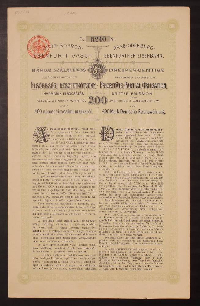 Die Raab-Ödenburg-Ebenfurther Eisenbahn hat auf Grund der Generalversammlungs-Beschlüsse vom 10. September 1896, resp. vom 27. Juni 1897, der Gesetz-Artikel XXIX vom Jahre 1896, resp. XXVI vom Jahre 1897, und ihrer statutarisch hinterlegten Prioritäts-Haupt-Obligation ddto Budapest 1. October 1897 17,500, d. i. siebzehntausend fünfhundert mit den laufenden Nummern 1.- bis 17,500 versehene, über je 200, d. i. zweihundert österr. Goldgulden oder 400, d. i. vierhundert Mark deutsche Reichswährung lautende, mit 3, d. i. drei Percent in Gold zu verzinsende Prioritäts-Partial-Obligationen emittirt, in welchen auch diese Partial-Obligation inbegriffen ist. Die Raab-Ödenburg-Ebenfurther Eisenbahn verwendet von diesen Partial-Obligationen 14,071 Stück, d. i. Nominale 2.814,200 österreichische Goldgulden oder 5.628,400 Mark deutsche Reichswährung auf Grund des Gesetz-Artikels XXIX vom Jahre 1896 zur eigenthümlichen Erwerbung der Nominale Gulden 3.054,100 österreichischer Währung betragenden, auf eine Dividende von 5 %, berechtigenden Prioritäts-Actien der durch den obgenannten Gesetz-Artikel concessionirten Neusiedler Seebahn-Actiengesellschaft. Diese Prioritäts-Actien bilden eine specielle Sicherheit der Prioritäts-Obligationen dritter Emission und das nach denselben einfliessende Einkommen ist zur Verzinsung und Amortisirung dieser Obligationen dritter Emission zu verwenden. Die Raab-Ödenburg-Ebenfurther Eisenbahn darf die Prioritäts-Actien der Neusiedler Seebahn-Actiengesellschaft nur mit Bewilligung der hohen Regierung verkaufen. Die aus dem eventuellen Verkaufe einfliessenden Summen müssen zur Einlösung im Wege einer aussertourlichen Verlosung, oder eines börsenmässigen Rückkaufes dieser Prioritäts-Obligationen dritter Emission verwendet werden ...“