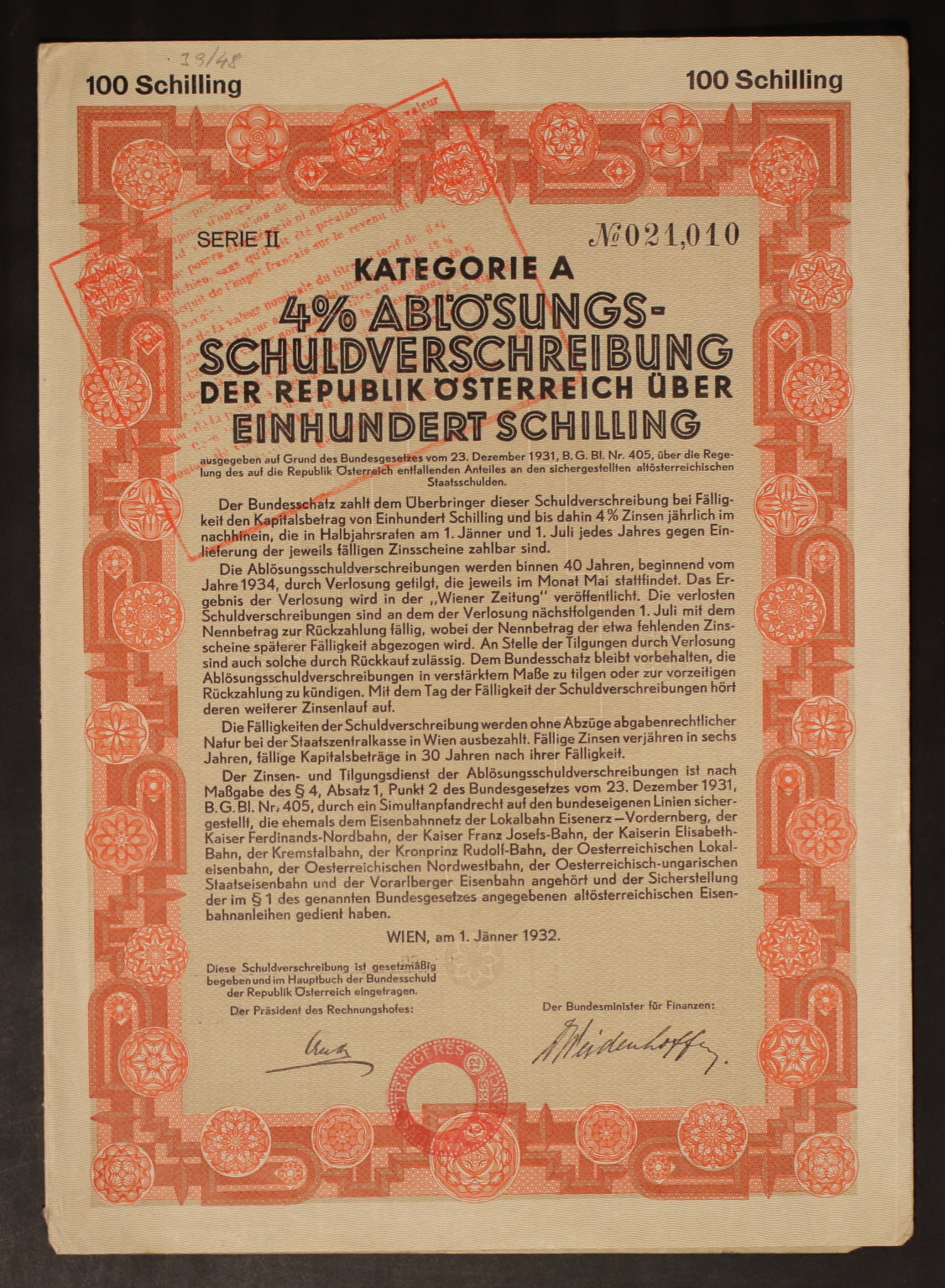 Zur Finanzierung der LB Eisenerz-Vordernberg, der Kaiser Ferdinands-Nordbahn, der Kaiser Franz Josefs-Bahn, der Kaiserin Elisabeth-Bahn, der Kremstalbahn, der Kronprinz Rudolf-Bahn, der Oesterr.Lokaleisenbahn, der Oesterr.Nordwestbahn, der Oesterr.-ungar.Staatseisen-bahn und der Vorarlberger Eisenbahn; Anleihen aus der Zwischenkriegszeit sind sehr selten; abgestempelt, in grau-rot. Erneuerungsschein und Zinsscheine (Nr. 1-30) vorhanden.