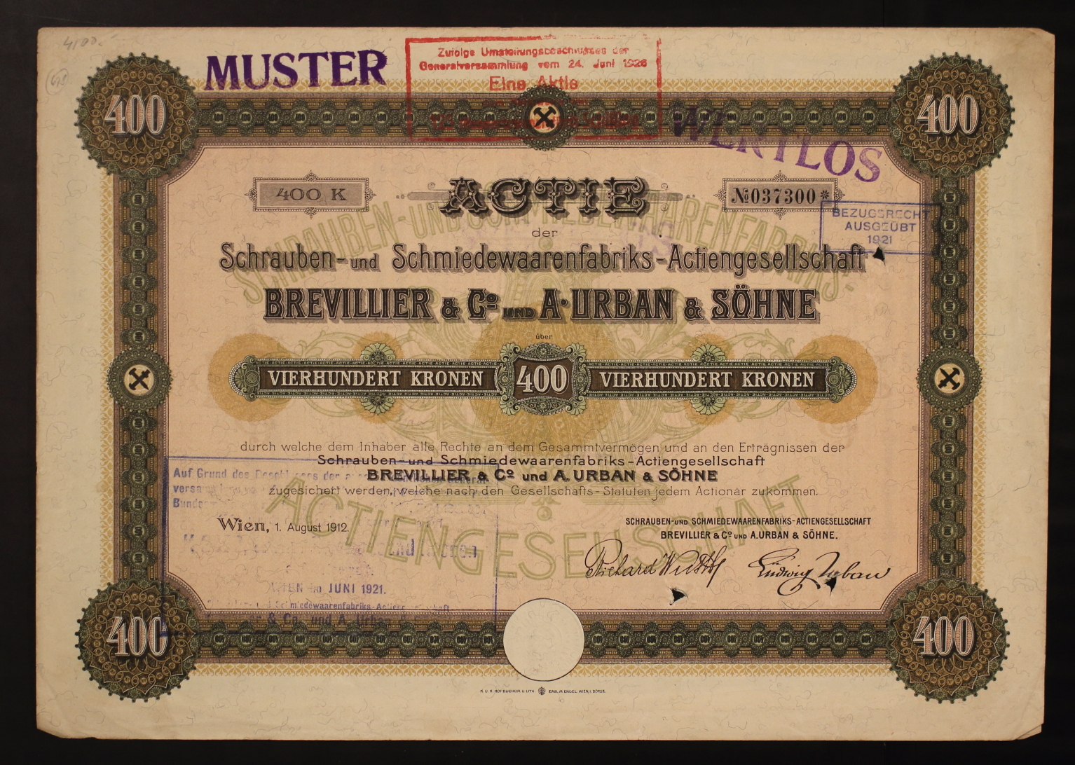 400 K, No. 037300. Actie der Schrauben- und Schmiedewaarenfabriks-Actiengesellschaft Brevillier & Co und A. Urban & Söhne über Vierhundert 400 Kronen durch welche dem Inhaber alle Rechte an dem Gesammtvermögen und an den Erträgnissen der Schrauben- und Schmiedewaarenfabriks-Actiengesellschaft Brevillier & Co und A. Urban & Söhne zugesichert werden, welche nach dem Gesellschafts-Statuten jedem Actionär zukommen. Schrauben- und Schmiedewaarenfabriks-Actiengesellschaft Brevillier & Co und A. Urban & Söhne: [Unterschrift unleserlich], Ludwig Urban.“ Erstmals angeboten, sehr selten, abgestempelt (rot „Zufolge Umstellungsbeschlusses der / Generalversammlung vom 24.Juni 1926 / Eine Aktie“, in blau „WERTLOS“, „BEZUGSRECHT AUSGEÜBT 1921“ „Auf Grund des Beschlusses der ausserordentlichen General-/ versammlung vom ..... Wien im JUNI 1921. / Schrauben- und Schmiedewaarenfabriks – Actiengesellschaft
