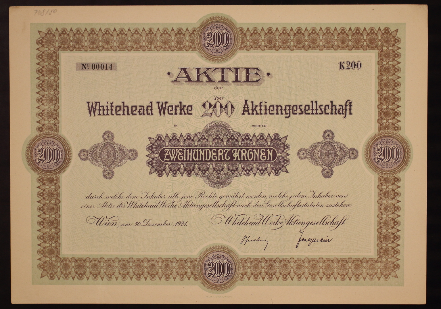 „No. 00014, K 200. Aktie der Whitehead Werke Aktiengesellschaft über 200 in Worten Zweihundert Kronen durch welche dem Inhaber alle jene Rechte gewährt werden, welche jedem Inhaber von einer Aktie der Whitehead Werke Aktiengesellschaft nach den Gesellschaftsstatuten zustehen. Wien, am 30. Dezember 1921. Whitehead Werke Aktiengesellschaft: ... [Unterschrift unleserlich], Josef Maier.