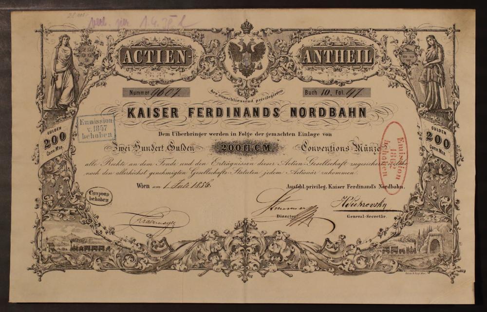 „Nummer 9607, Buch 10, Fol. 97. Actien-Antheil der ausschliessend privilegirten Kaiser Ferdinands Nordbahn. Dem Überbringer werden in Folge der gemachten Einlage von Zwei Hundert Gulden 200 fl. C.M. Conventions Münze alle Rechte an dem Fonde und den Erträgnissen dieser Actien-Gesellschaft zugesichert welche nach den allerhöchst genehmigten Gesellschafts-Statuten jedem Aktionär zukommen. Wien, am 1. Juli 1856. Ausfehl. Privileg. Kaiser Ferdinand's Nordbahn. Director: Stummer. Generalsekretär: H. Sichrovsky.“ Weiters im linken Blattbereich unten Unterschrift: „Kratzmayer”. Blauer Stempel im linken Blattbereich:„Emission v. 1857 behoben“. Roter Stempel im rechten Blattbereich: „Emission 1862 behoben“. Kleinerer schwarzer Stempel im unteren linken Blattbereich:„Coupons behoben“.