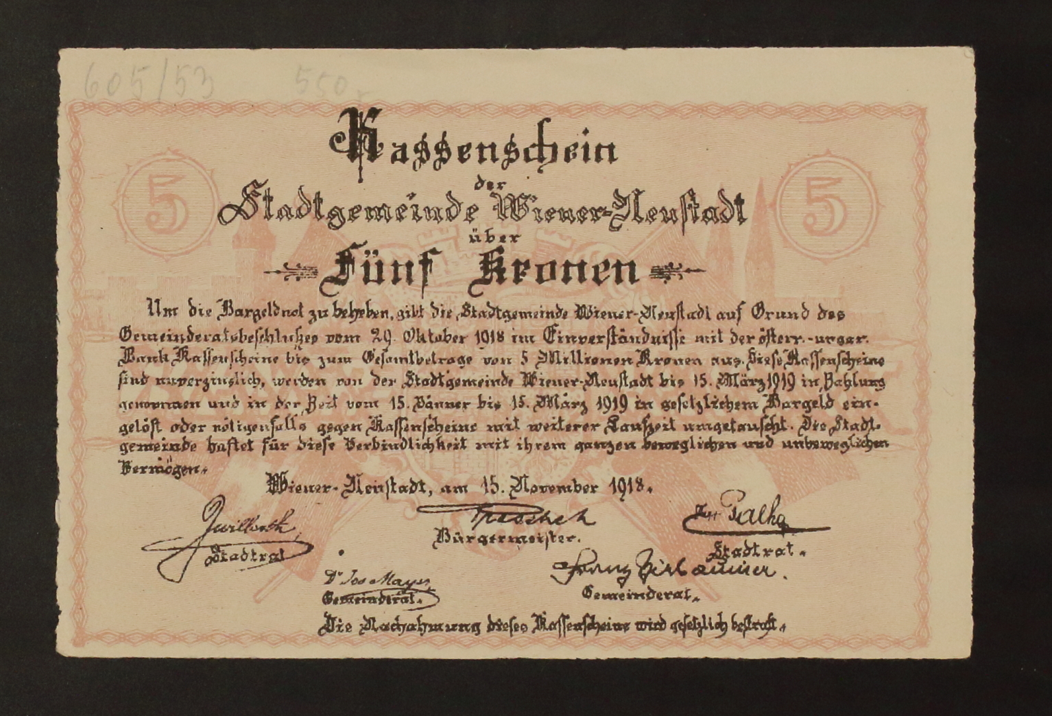 Um die Bargeldnot zu beheben, gibt die Stadtgemeinde Wiener Neustadt auf Grund des Gemeinderatsbeschlusses vom 20. Oktober 1918 im Einverständnisse mit der österr.-ungar. Bank Kassenscheine bis zum Gesamtbetrage von 5 Millionen Kronen aus. Diese Kassenscheine sind unverzinslich, werden von der Stadtgemeinde Wiener Neustadt bis 15. März 1919 in gesetzlichem Bargeld eingelöst oder nötigenfalls gegen Kassenscheine mit weiterer Laufzeit eingetauscht. Die Stadtgemeinde haftet für diese Verbindlichkeit mit ihrem ganzen beweglichen und unbeweglichen Vermögen. Wiener Neustadt, am 15. November 1918.