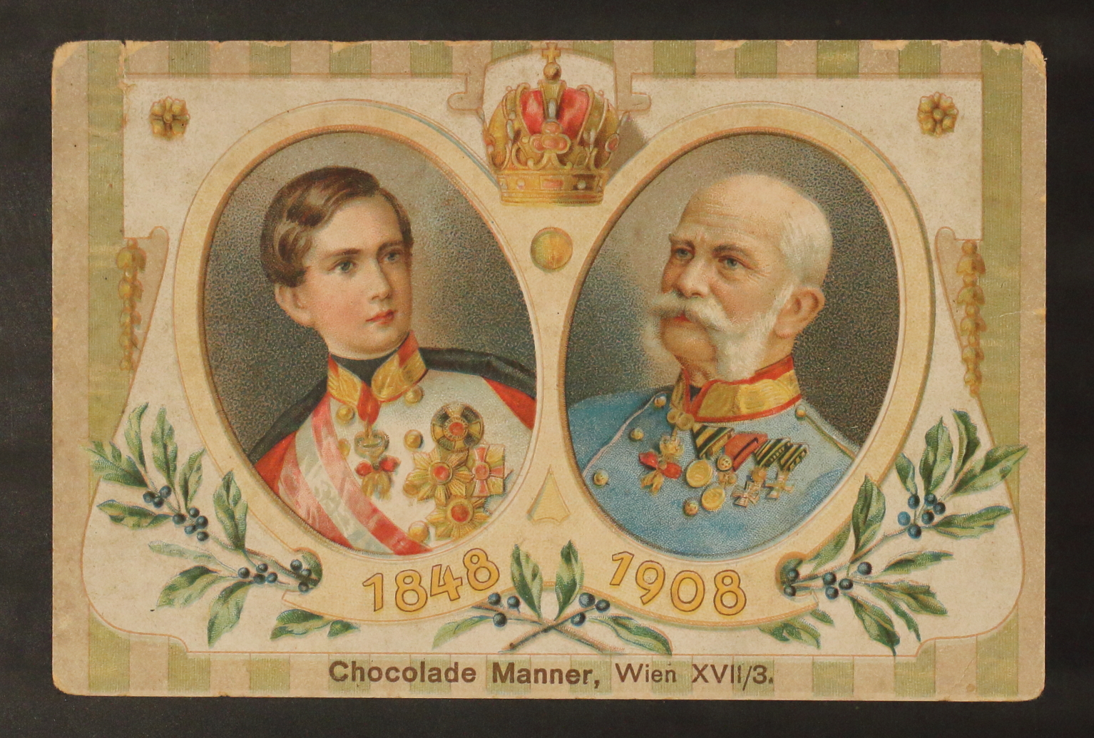 Chocolade Manner Postkarte zum 60jährigen Regierungsjubiläum Kaiser Franz Josephs, mit Abbildungen des Kaisers von 1848 und 1908 und Kaiserkrone, auf der Rückseite Abbildung der berühmten Manner-Dose.