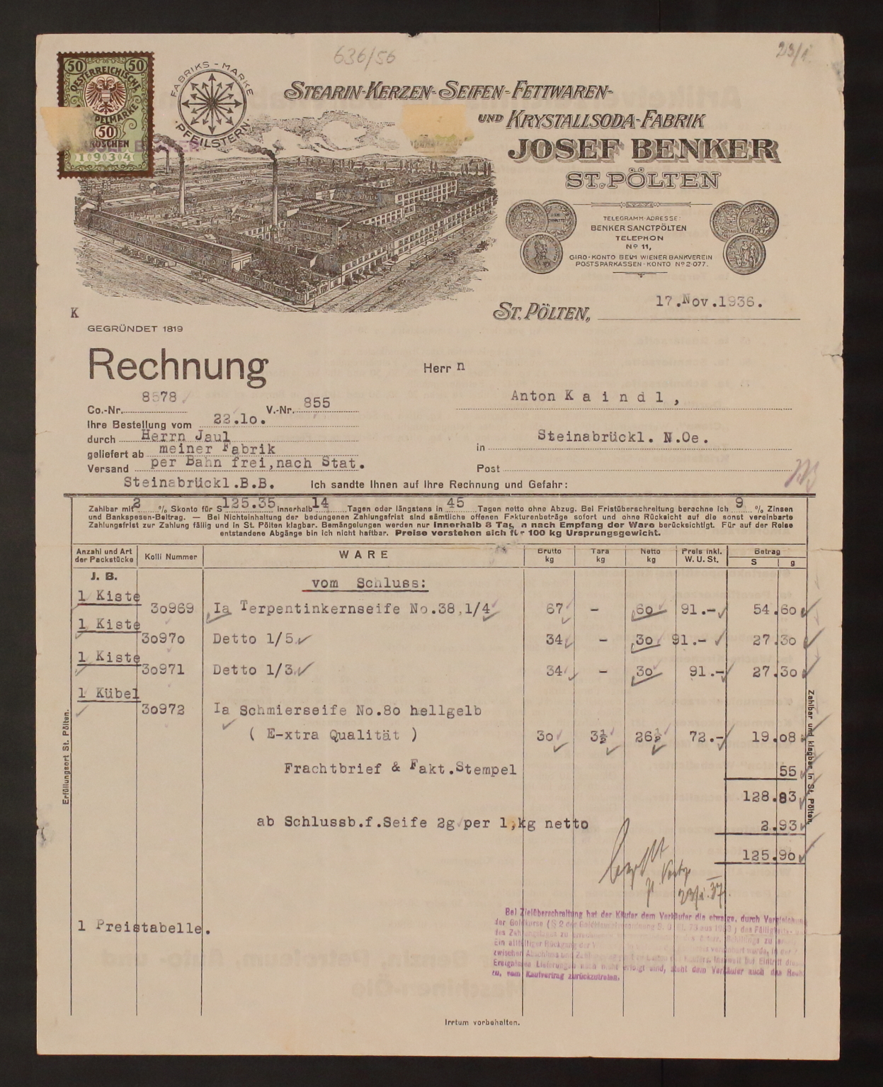Rechnung über S 125,90 für verschiedene Seifen, lautend auf Anton Kaindl/Steinabrückl, mit dekorativem Briefkopf. Abbildung der Fabrik mit Finanzstempelmarke. Farbe weiß und schwarz.