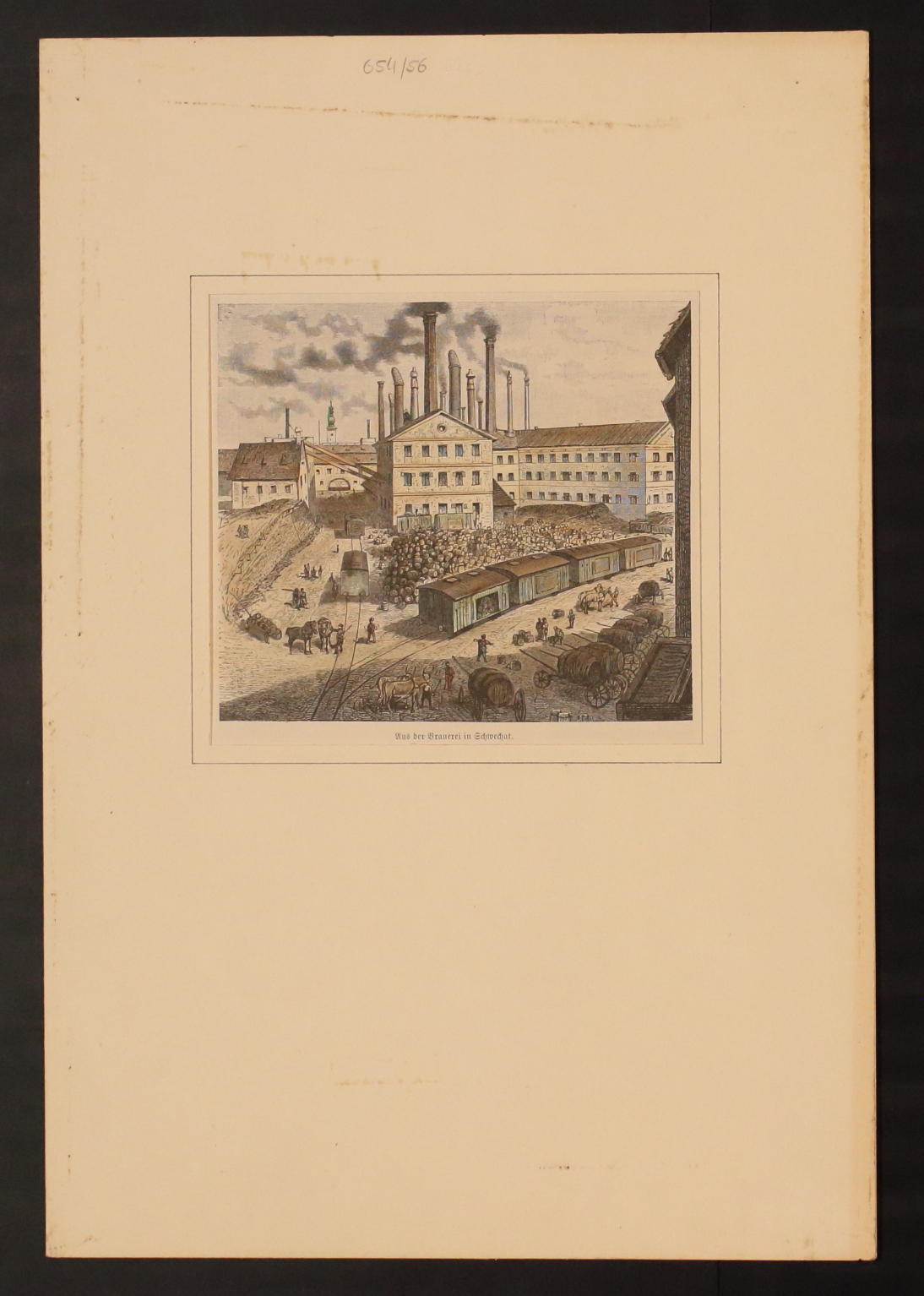 Farblithographie im Paspartout, Abb. der Brauerei, Bierfässer und –karren, Männer, Pferde, Ochsen.