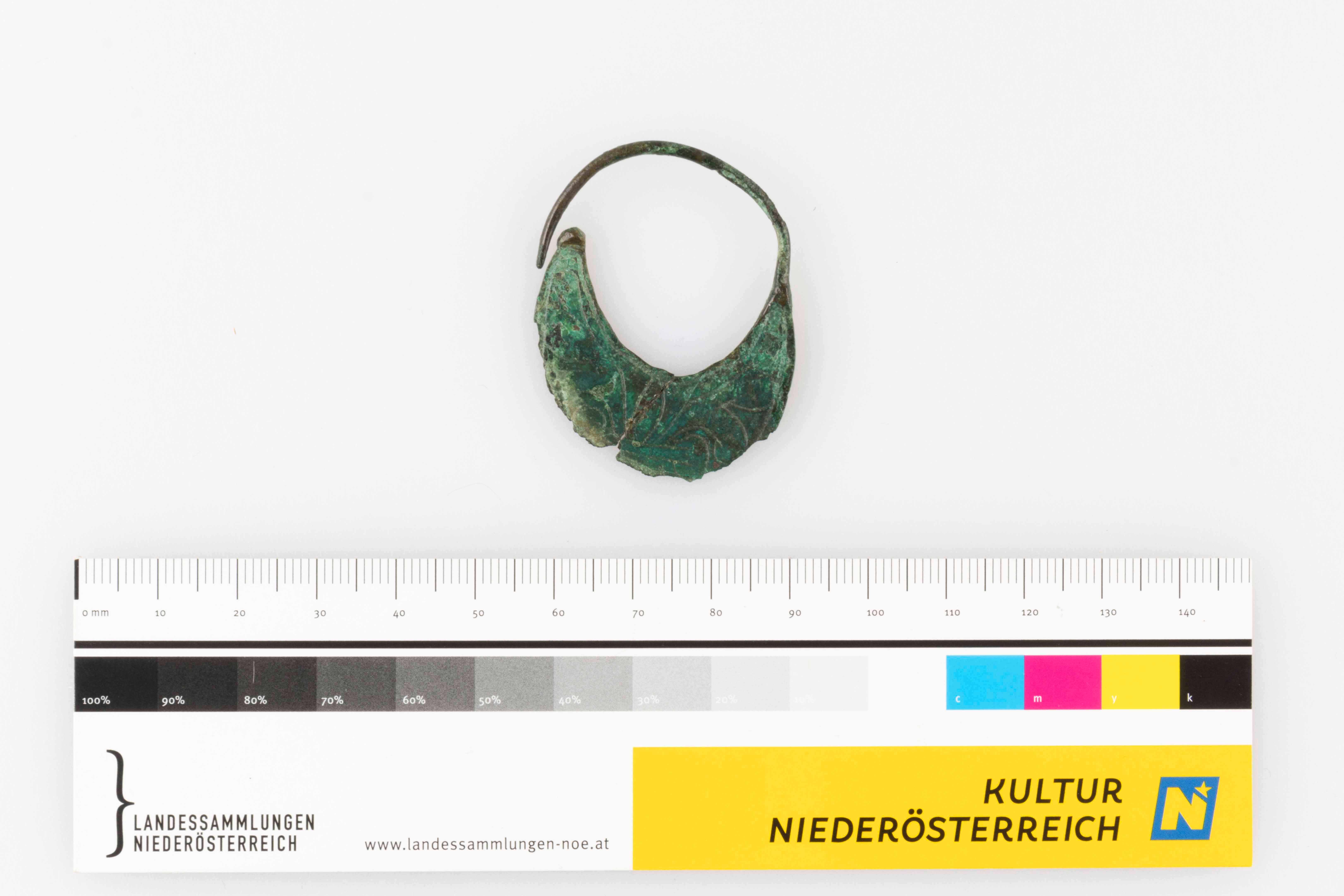 Halbmondförmiger Kopfschmuckring, Buntmetall, Blechlunula leicht beschädigt und geklebt. Florales Motiv .