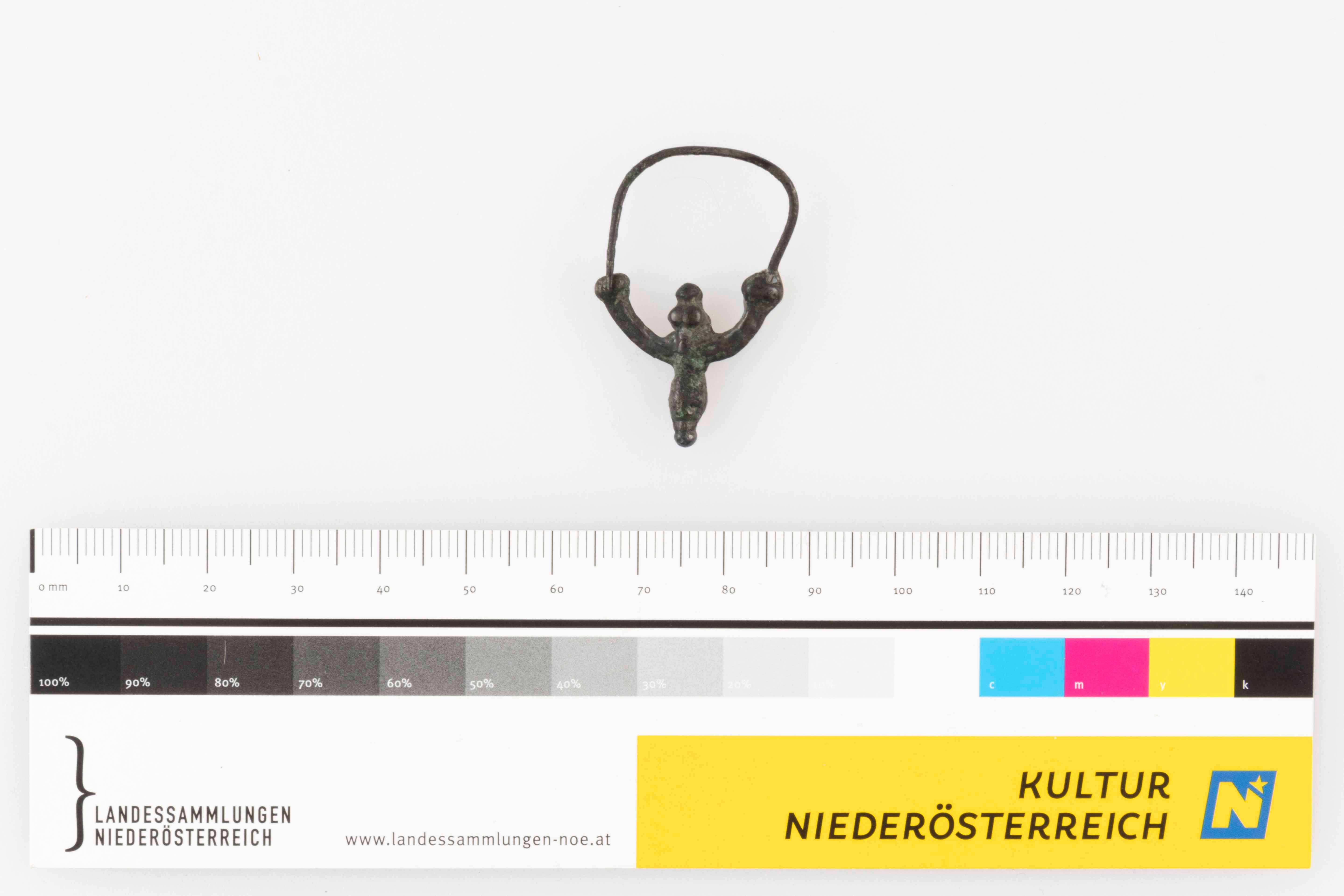 Kopfschmuckring, Buntmetall gegossen. Imitation eines granulierten Traubenohrgehänges. Bügel dünn, Anhänger mit zwei Knötchen an den Enden und traubenförmige Pendilie voll gegossen.
