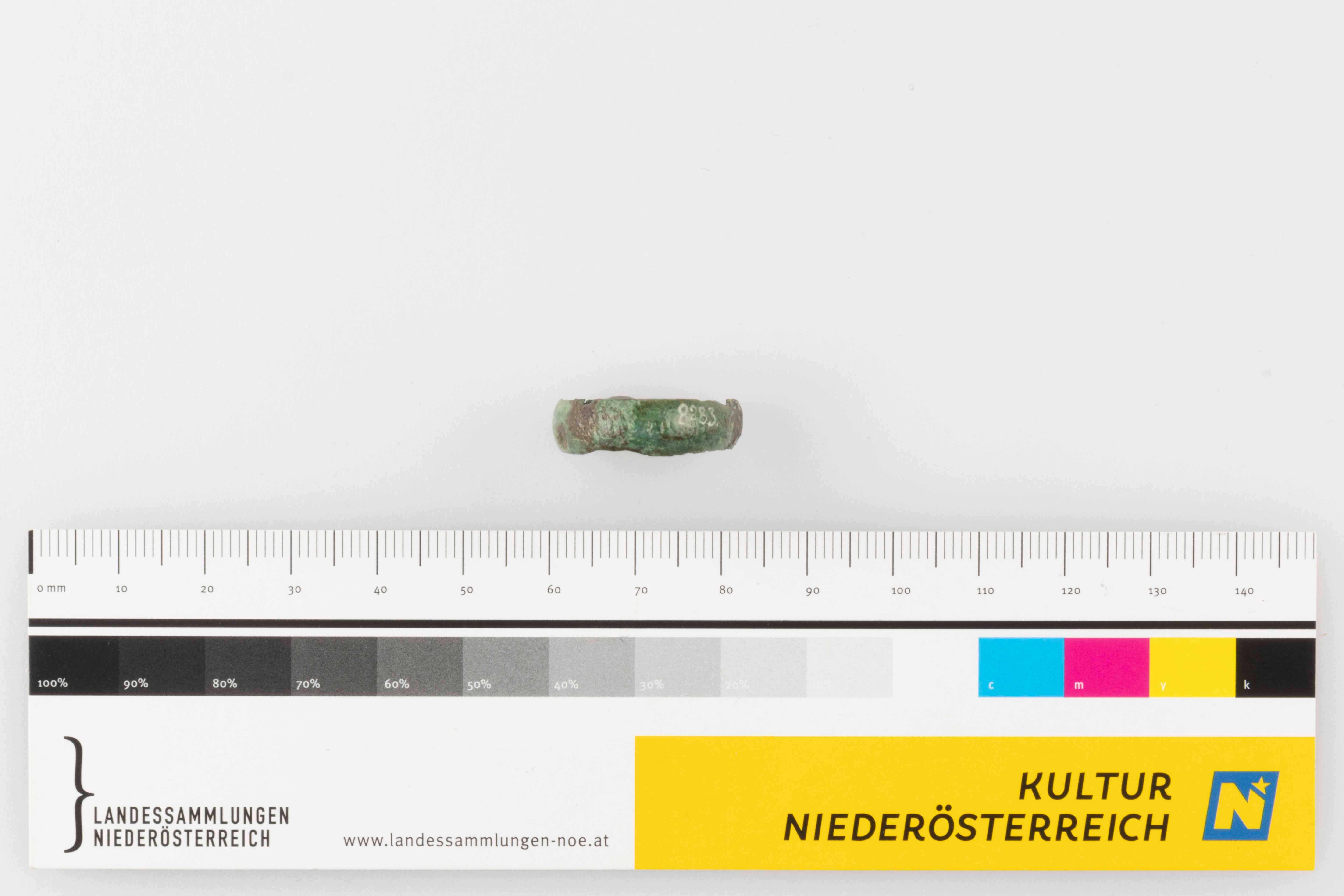 Bandfingerring aus Buntmetallblech, leicht beschädigt, Enden etwas aufgebogen, unverziert.