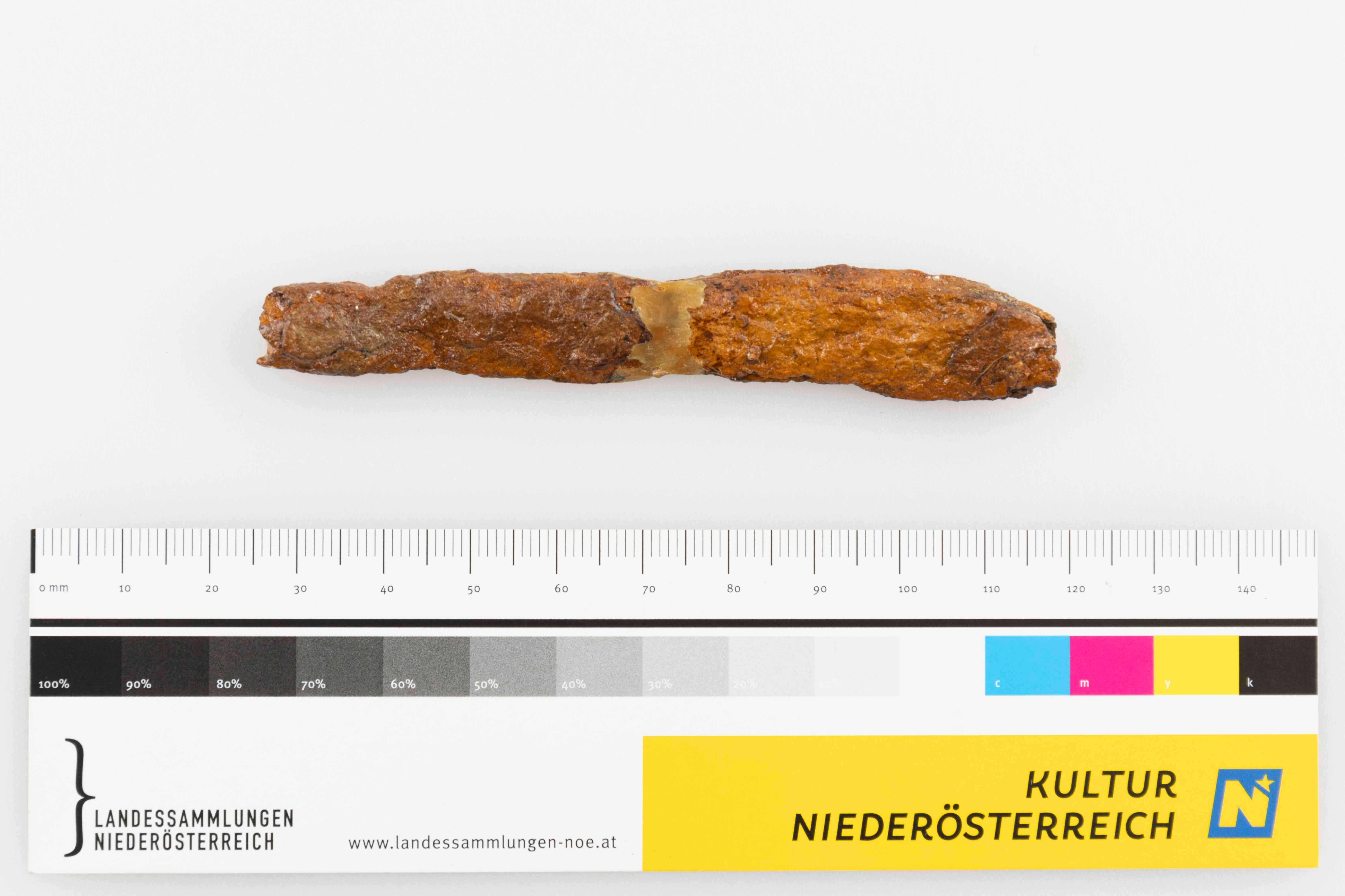 Stark korrodiertes Eisenmesserfragment, Klingenspitze und Griffangel fehlen.