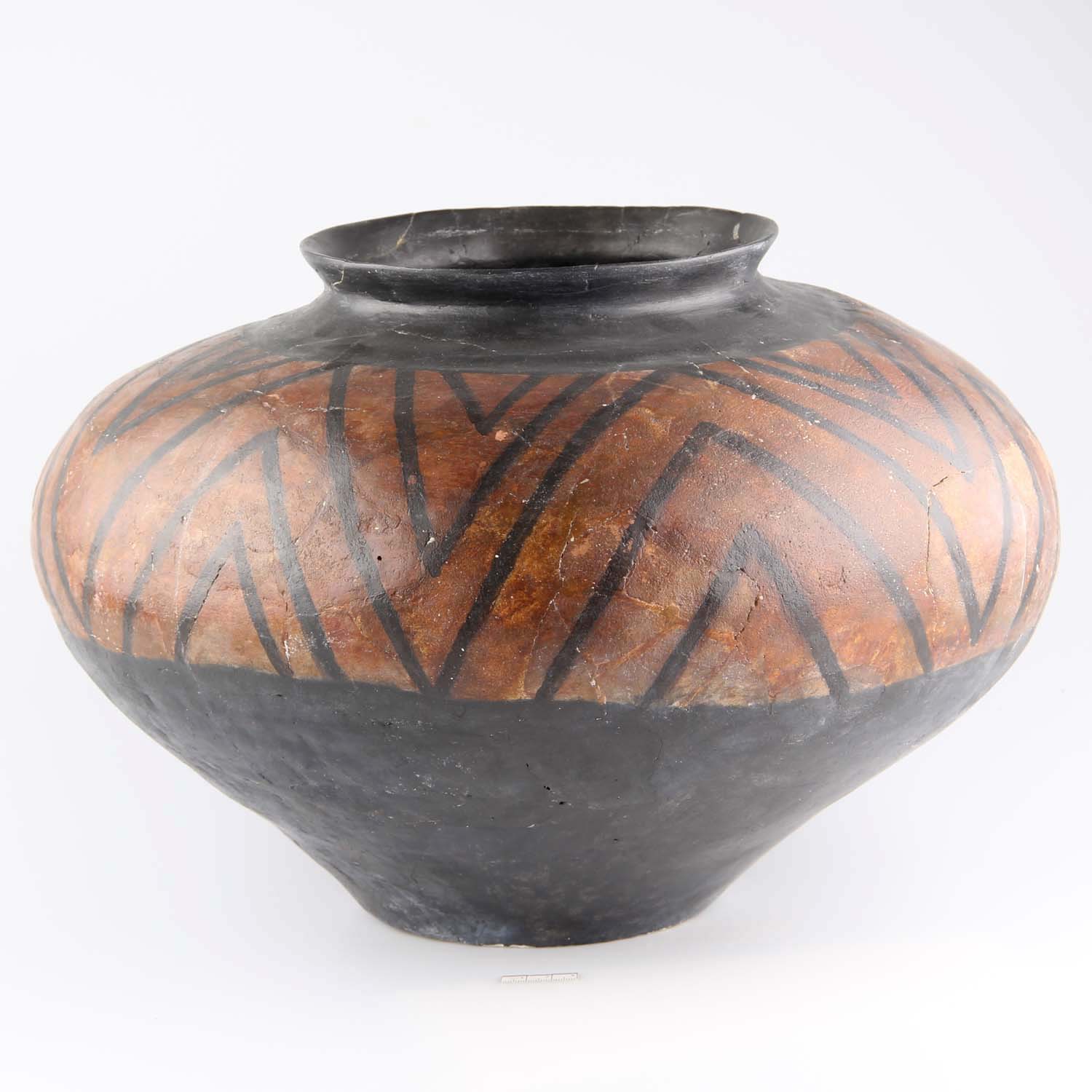 Scherbenbeschaffenheit: unbestimmbar. Außenoberfläche: hellbraun, poliert, schwarz-rot bemalt. Innenoberfläche: graubraun, geglättet. Form: ebene Standfläche, konischer Oberteil, deutlicher Bauchumbruch, Oberteil stark gewölbt, flach konischer, niedriger Hals, trichterförmig ausladender Mundsaum. Verzierung: Mundsaum: beidseitig schwarz bemalt. Hals: schwarz bemalt. Hals-/Schulterumbruch: 1 waagrechte, umlaufende, 1,2 cm breite Kannelur, schwarz bemalt. Schulter/Bauch: umlaufendes Zickzackband mit eingeschriebenen, jeweils stehenden bzw. hängenden Winkeln aus schwarzen Graphitstreifen. Unterteil: schwarz bemalt.