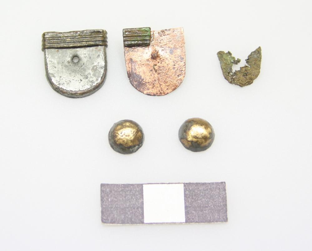 Kurze Riemenzunge wie 19018.011.2.2, Teile der Zwinge fehlen. Zwischen Vorder- und Rückblech Teile des Holzkerns erhalten. Oberhalb der Zwinge befanden sich zwei Ziernieten am Lederriemen