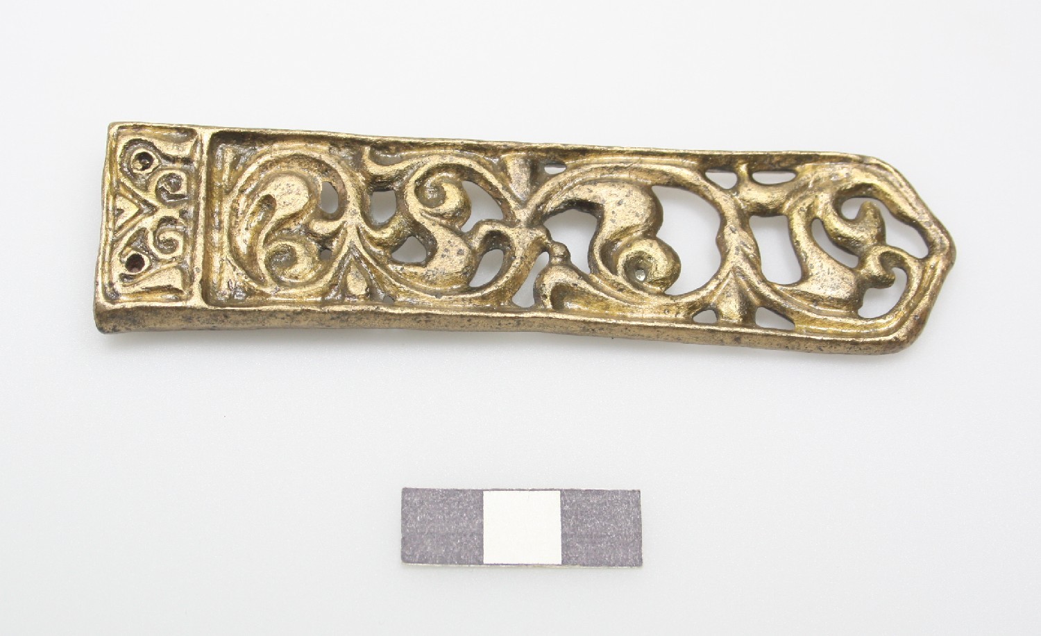 Hauptriemenzunge, Buntmetallguss, mit durchbrochener Rankenzier; L 11,3, B 2,9, D bei der Zwinge 0,9 cm, Gewicht 72,7 g