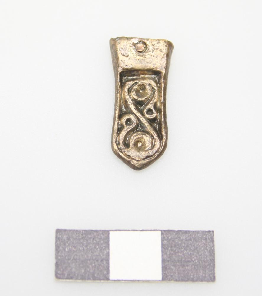 Gegossene Nebenriemenzunge aus Buntmetall mit S-Rankenzier auf der Vorderseite und glatter Rückseite; L 2,8, B 1,3, D bei der Zwinge 0,36 cm, Gewicht 3,8 g