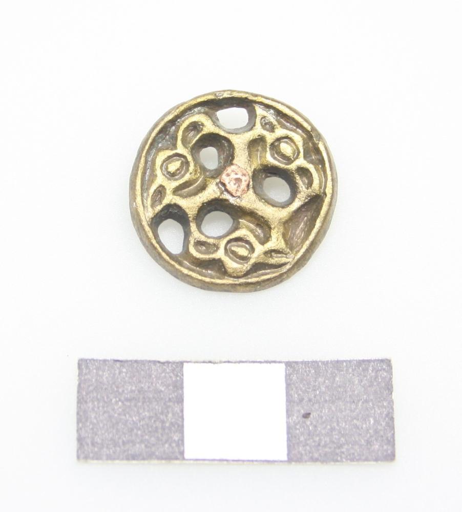 Rosettenförmiger Gürtelbeschlag, Buntmetall durchbrochen gegossen, mit drei Vogel- oder Greifenköpfen verziert.; Dm 2-2,1, D 0,15-0,2, Gewicht 1,3-1,5 g; zusammen 17,1 g