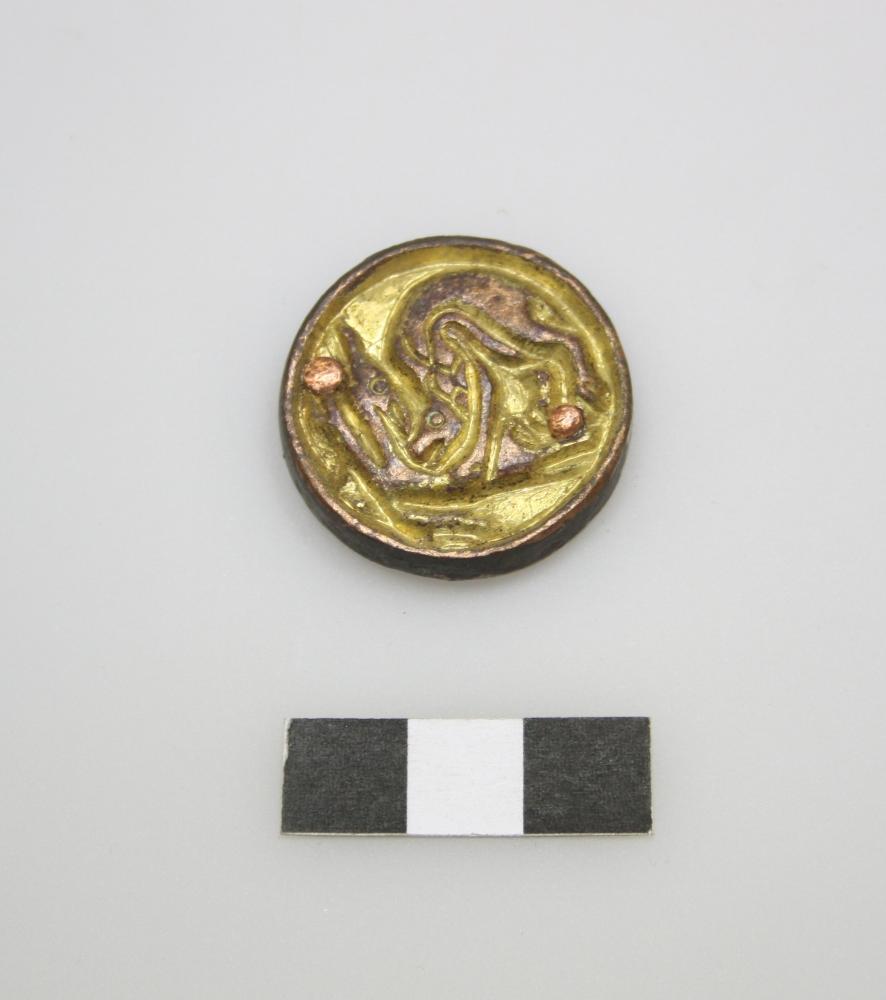 Gegossener, nachgearbeiteter und vergoldeter, rosettenförmiger Beschlag mit gut erkennbarer Tierkampfszene; Dm 2,9-3, D 0,5-0,6 cm, Gewicht 10,3-16,5 g, zusammen 75,6 g