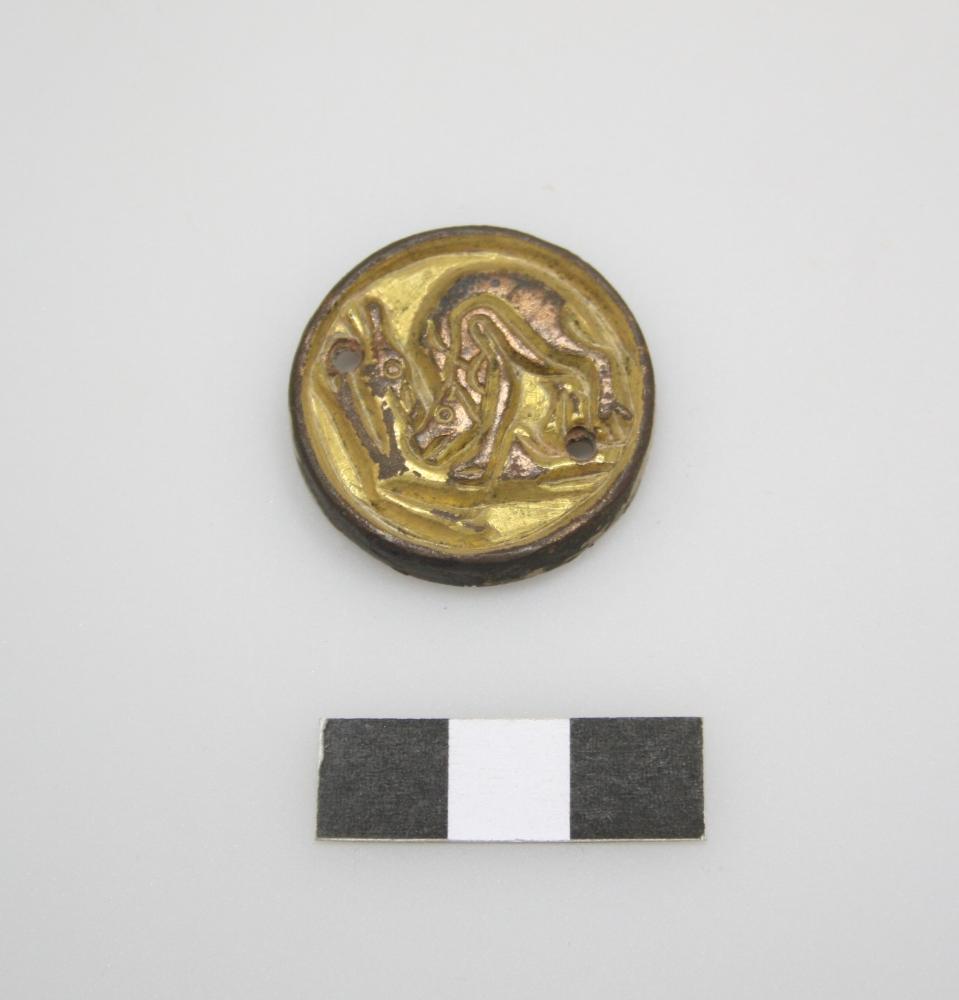 Gegossener, nachgearbeiteter und vergoldeter, rosettenförmiger Beschlag mit gut erkennbarer Tierkampfszene; Dm 2,9-3, D 0,5-0,6 cm, Gewicht 10,3-16,5 g, zusammen 75,6 g