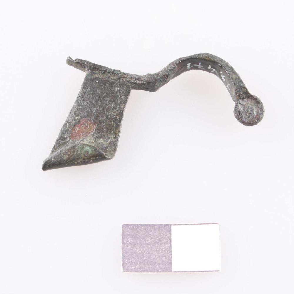 Zweigliedrige Armbrustfibel (A193), mit hohem Nadelhalter, bandförmiger Bügel mit bis zum Fußende reichender Punktverzierung und einer links und rechts begleitenden Rille, Fußknopf, Nadel und Spiralkonstruktion fehlen.