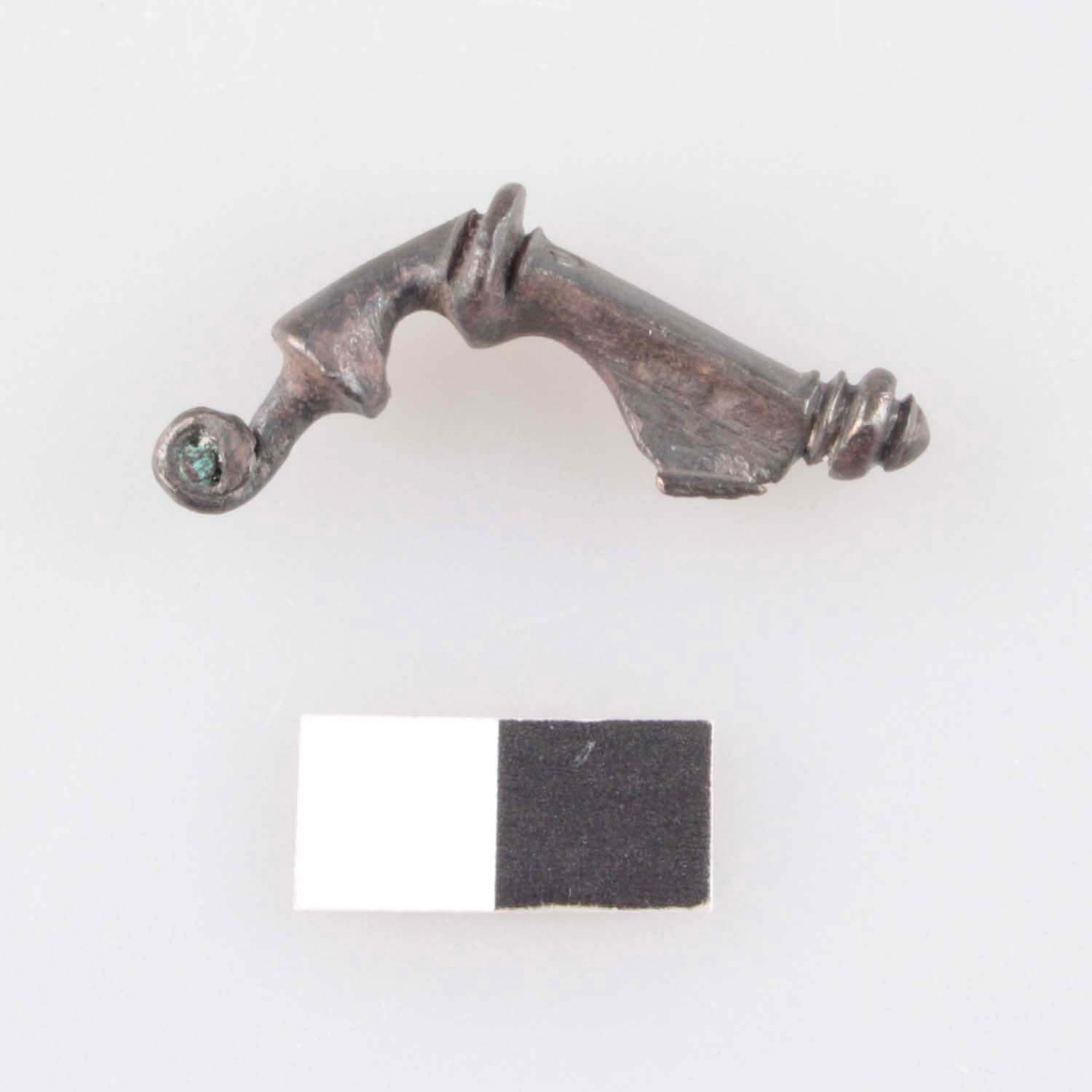 Eingliedrige Trompetenfibel aus Silber (Almgren 75), ohne Stützplatte, doppelt profilierter Bügelknopf, profilierter Fußknopf, niedriger Nadelhalter, zwei eingetsempelte Augen am Fußoberteil, Nadel und Spirale fehlen.