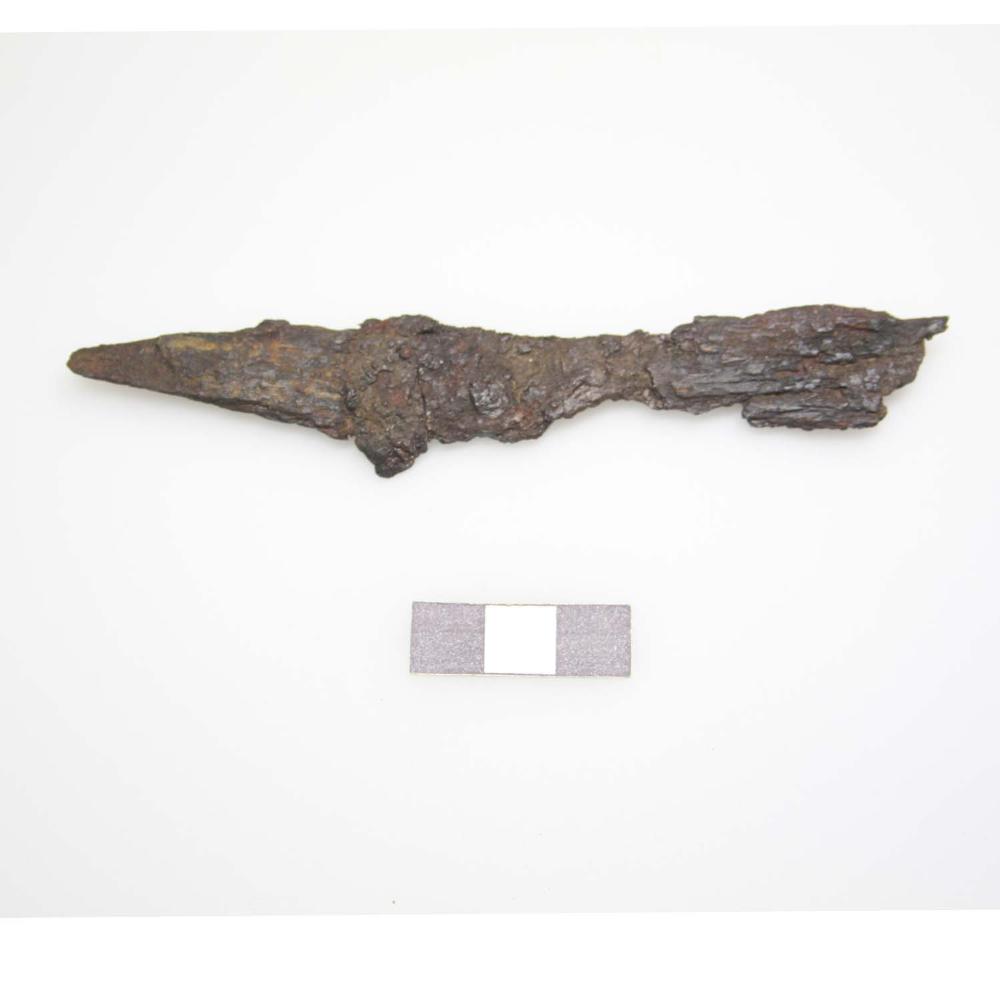 Fragmentiertes Eisenmesser mit ankorrodierten Holzresten am Griff