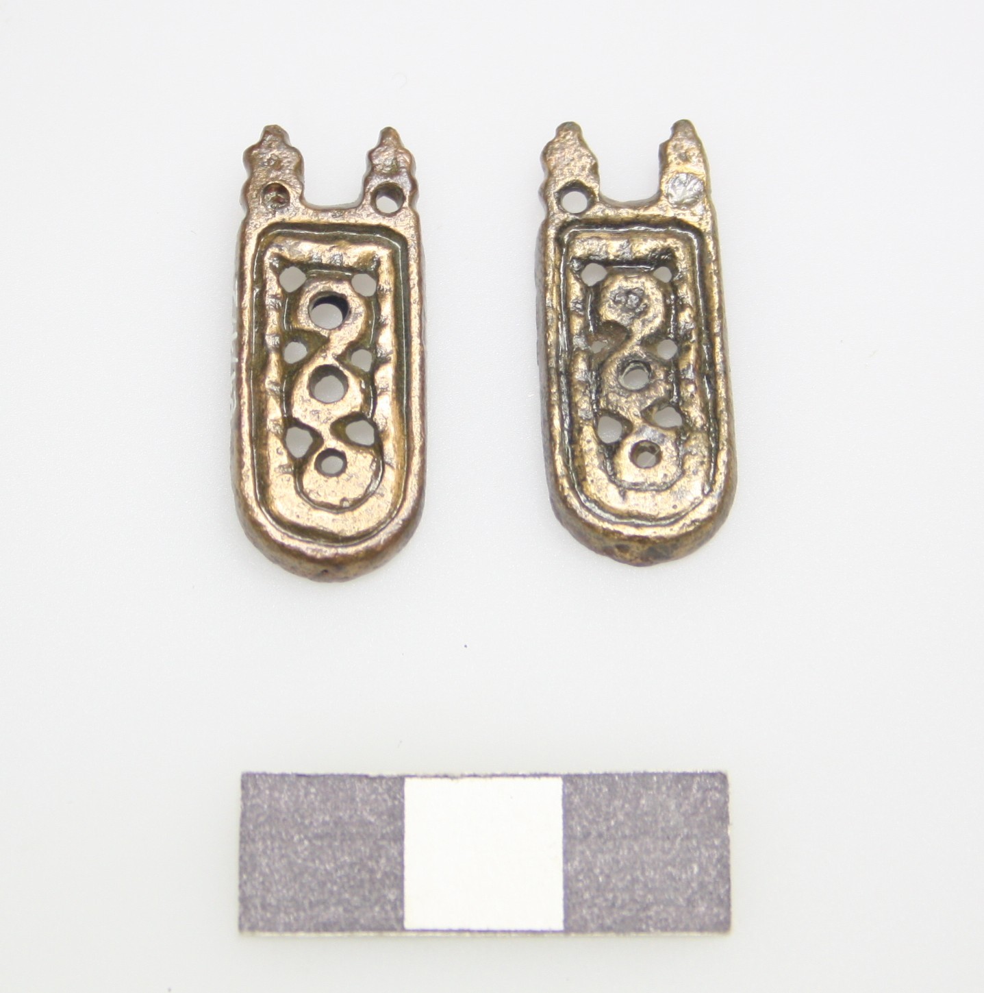 Zweiteilig durchbrochen gegossenen Nebenriemenzunge, mit Rankenzier und Fortsätzen an der Zwinge