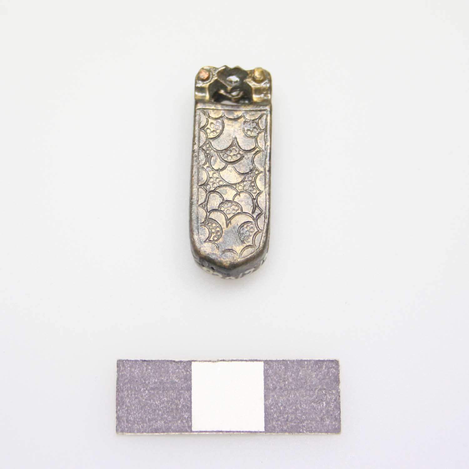 Nebenriemenzunge, doppelt gegossen, mit tierkopfförmigen Zwingen.Gravierte Palmettenzier mit Hintergrundpunzierung auf den Schauflächen und Schmalseiten, Gewicht 7,4-8,5 g, alle drei 23,1 g