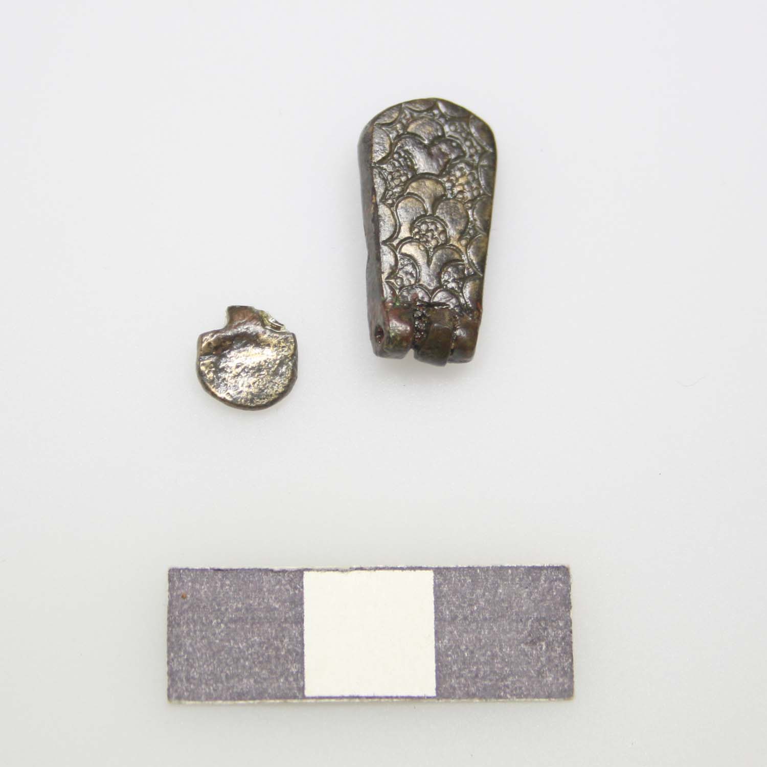 Zungenförmiger Scharnierbeschlag mit halbrundem Anhänger. Gravierte Palmettenzier mit Hintergrundpunzierung auf den Schauflächen, an den Rückseiten je zwei mitgegossene Nieten. Gewicht 2,6-3 g, ganzer Posten 27,7 g