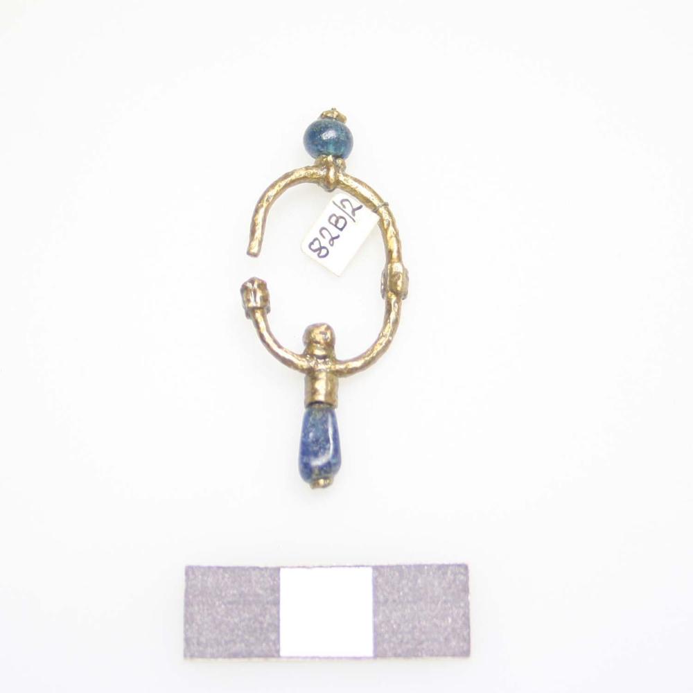 Ein ovaler, offener Ohrring, der aus rundstabigem Buntmetalldraht gefertigt ist. Zwei aufgesteckte Buntmetallhülsen weisen eine Buckelstruktur auf, die als Granulationsimitation bezeichnet wird. Am unteren Teil ist außerdem ein länglicher, blauer Glasanhänger angebracht. Darüber befindet sich eine Buntmetallhülse, die mit einem Buckel verziert ist. Im inneren Teil ist eine Bronzeperle angebracht. Die obere Glasperle ist rund und hat eine blaue Farbe.