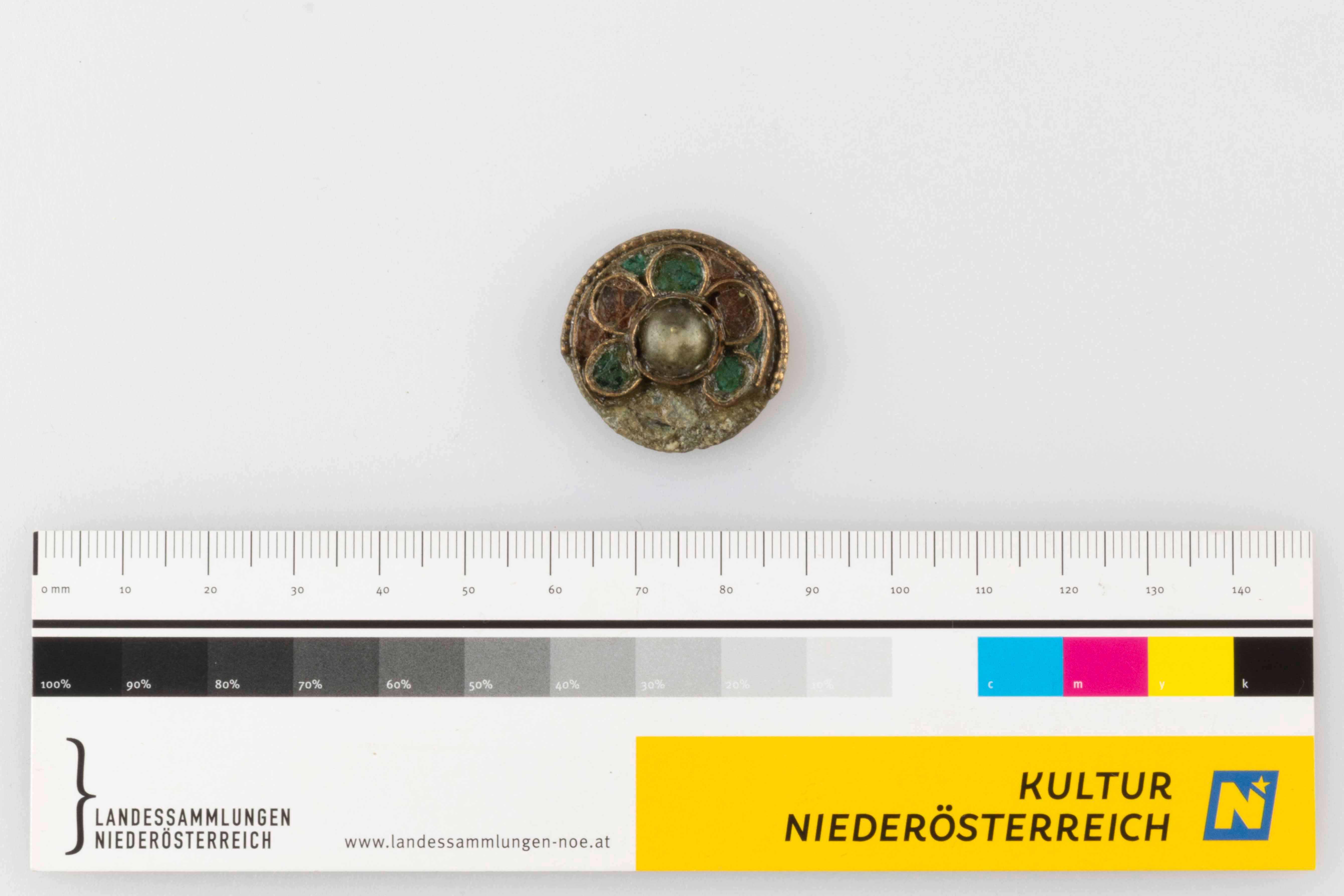 Eine in einem Säuglingsgrab gefundene Mantelschließe aus Buntmetallblech mit floralem Muster mit Einlagen aus abwechselnd grün und rotbraun gefärbtem Glas. In der Mitte eine Einlage aus farblosem Glas. Zwischen den Einlagen Streifen aus Buntmetallblech. Auf der Rückseite eine kleine Öse aus Buntmetall.