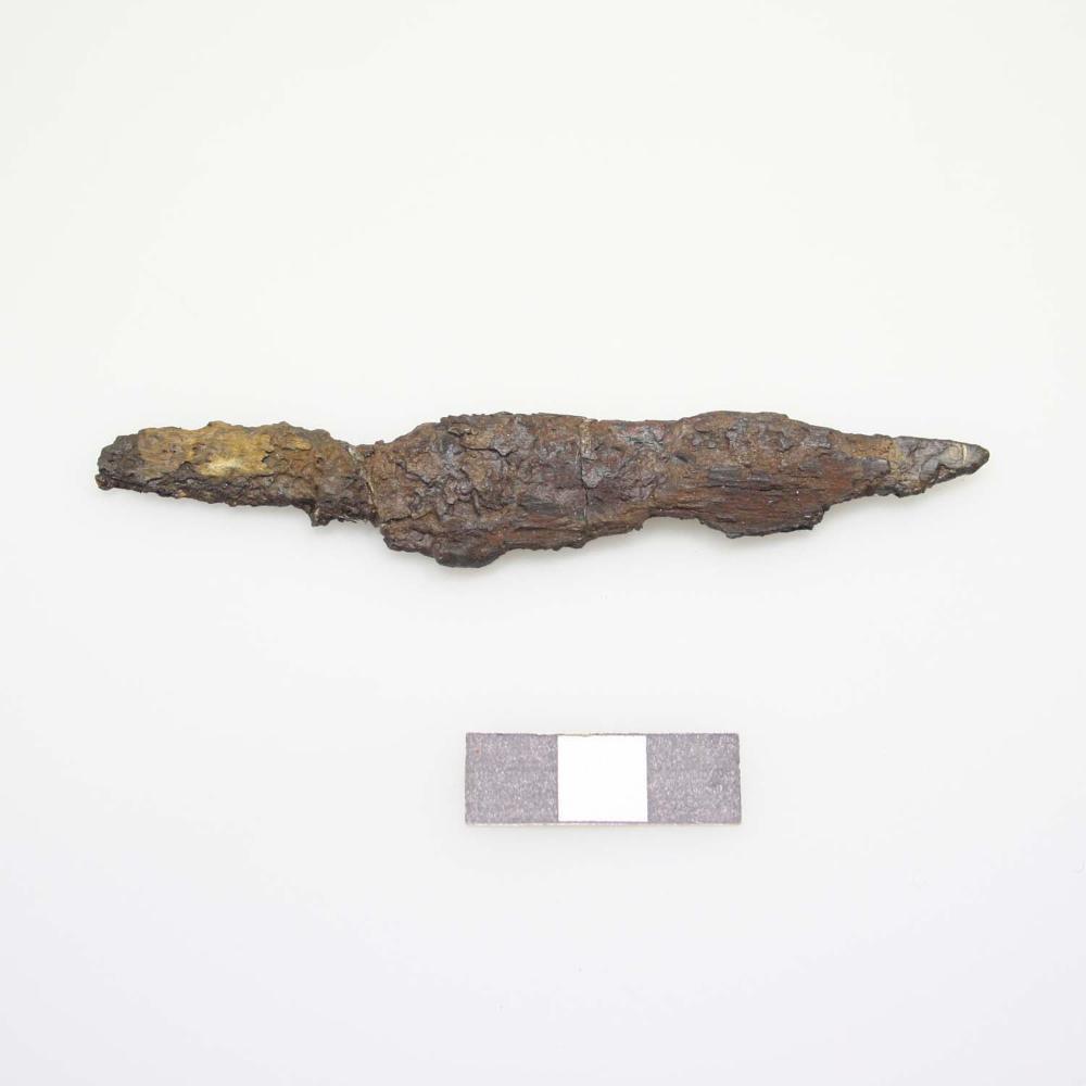 Fragmentiertes Eisenmesser mit ankorrodierten Holzresten am Griff