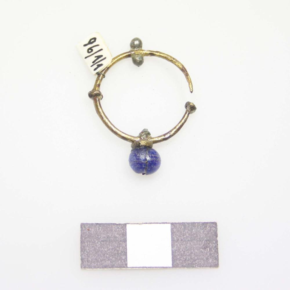 Offener Kopfschmuckring aus rundstabigem Buntmetalldraht, aufgeschlauft zwei Buntmetallringlein. Oben zwei gegenständig angelötete Buntmetallperlen, verzinnt oder versilbert, unten als Anhänger eine blaue Glasperle
