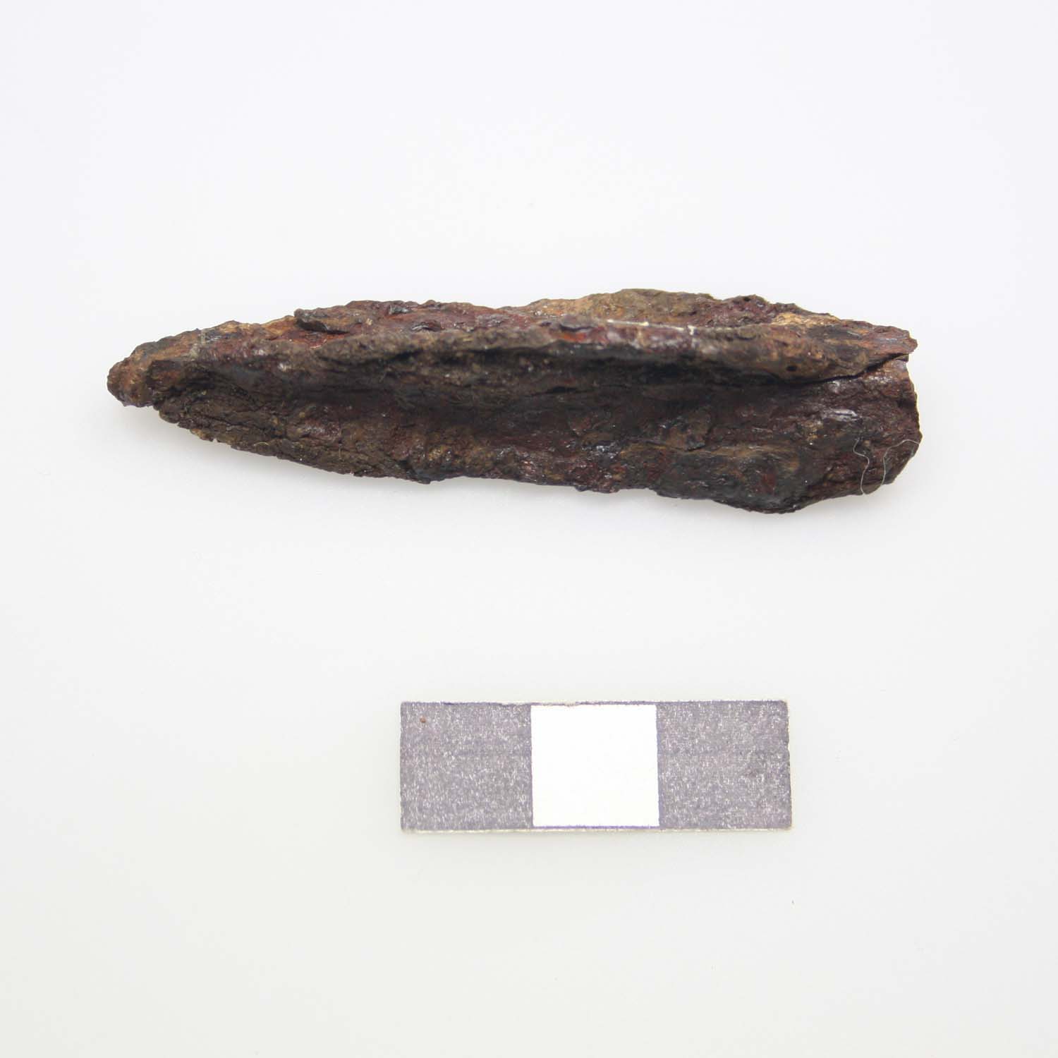 Dreiflügelige Pfeilspitze mit ankorrodierten Holzresten am Dorn, Dorn fehlt