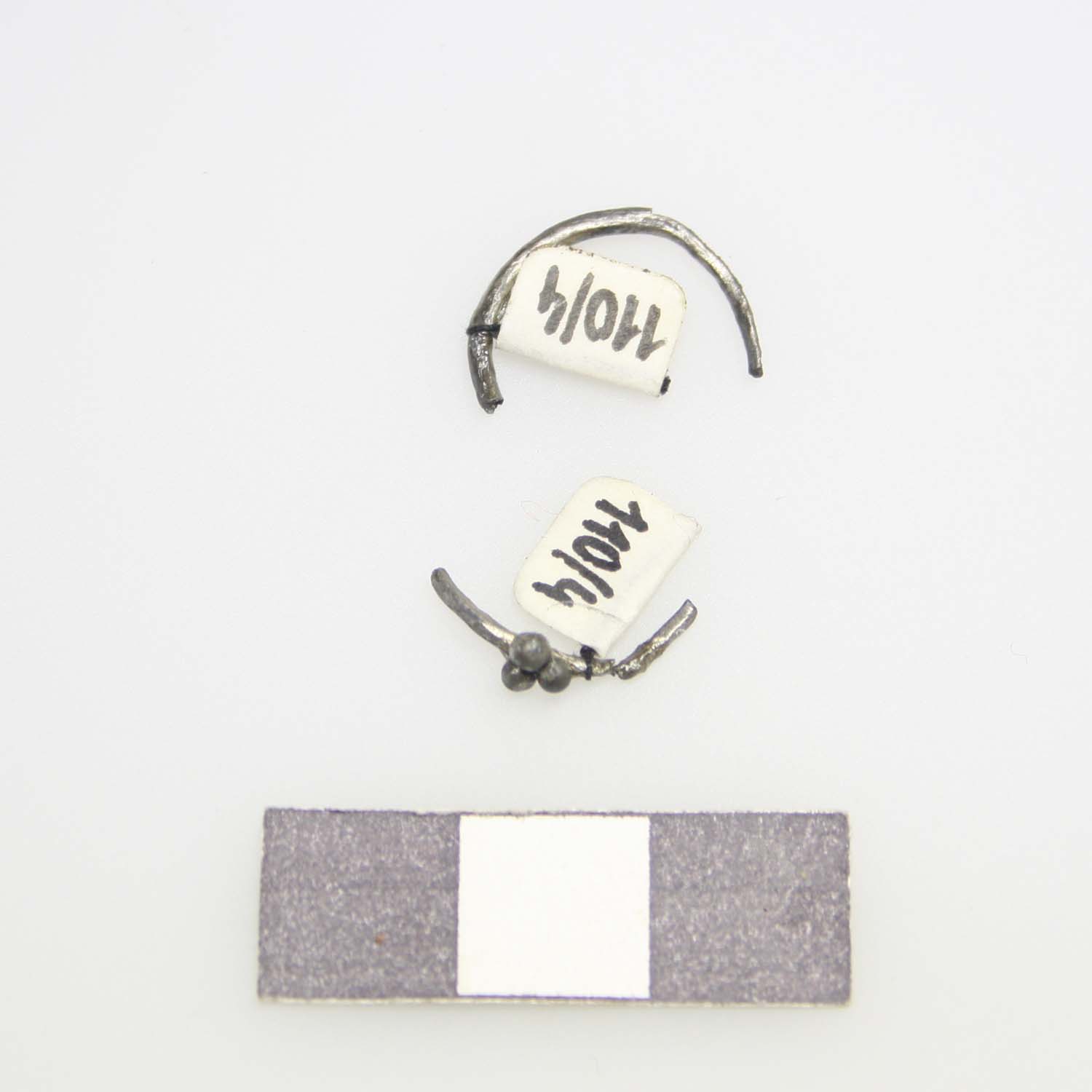 Fragmentierter Kopfschmuckring aus rundstabigem Silberdraht, mit drei angelöteten Silberkügelchen; Dm 1,7, Drahtstärke 0,14.