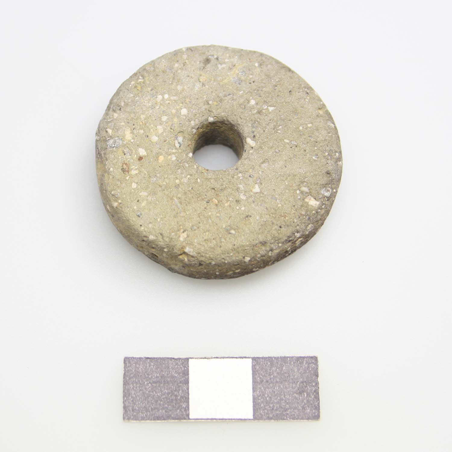 Scheibenförmiger Spinnwirtel aus gelbgrau gebranntem, feinem Ton, sehr unregelmäßig geformt