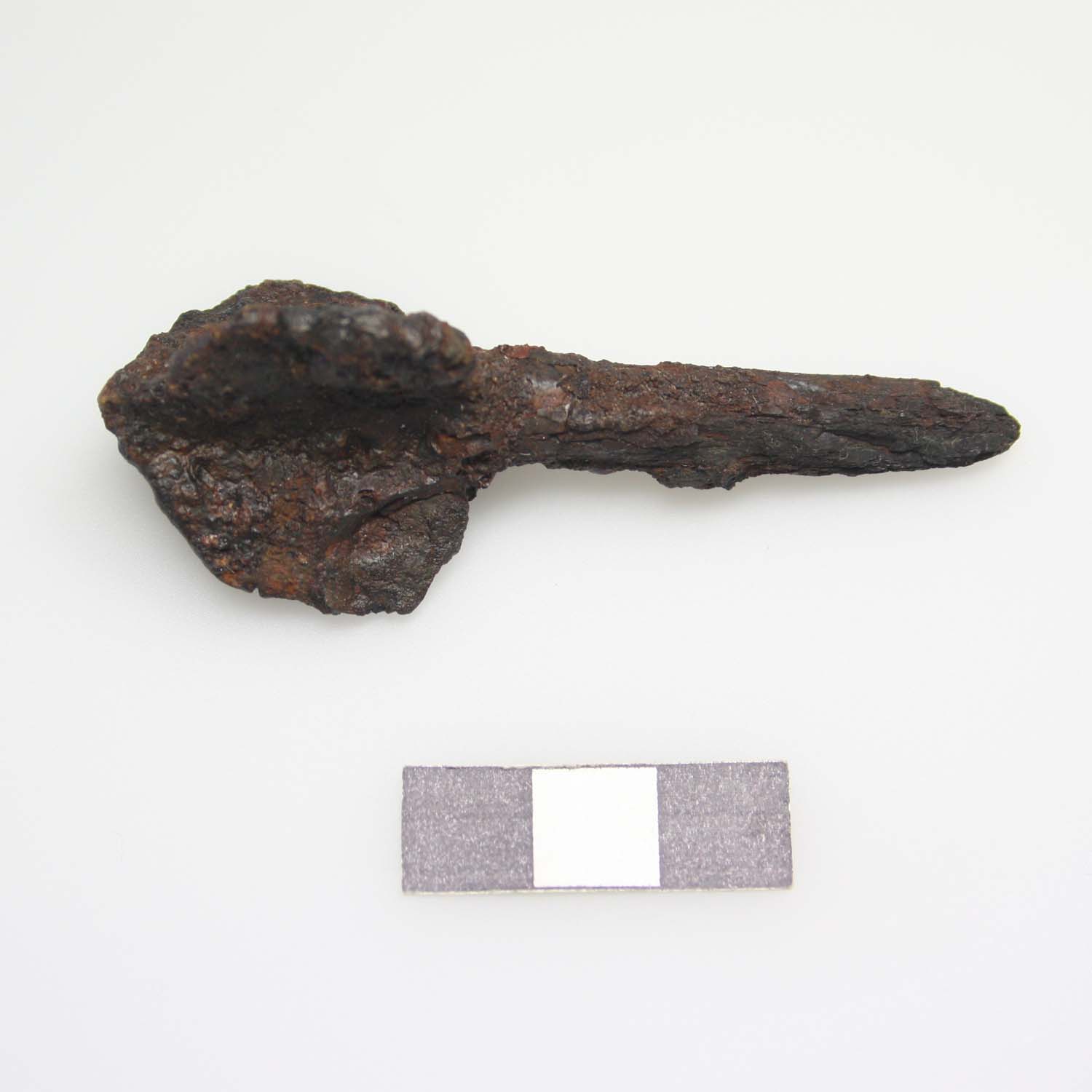 Gedrungene, dreiflügelige Pfeilspitze, am Dorn ankorrodierte Holzreste