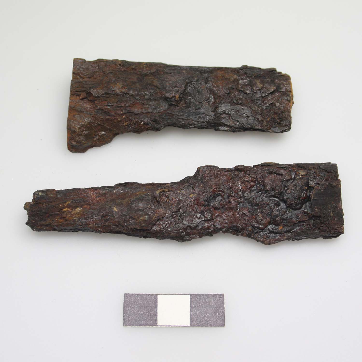 Langes Eisenmesser mit ankorrodiertem Eisenobjekt sowie anhaftenden Holzresten, wohl der Scheide, beprobt