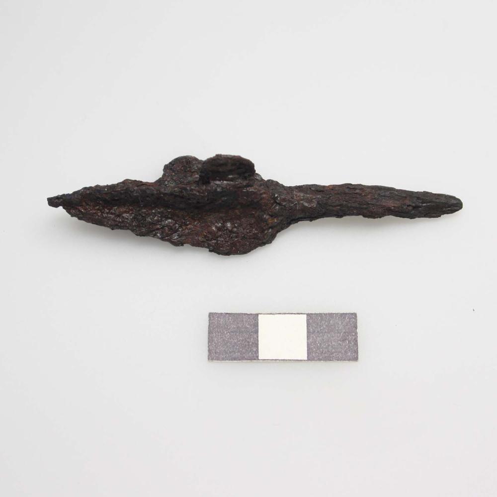 Dreiflügelige, eiserne Pfeilspitze mit ankorrodiertem Eisenfragment, am Dorn anhaftende Holzreste und organische Reste einer Umwicklung