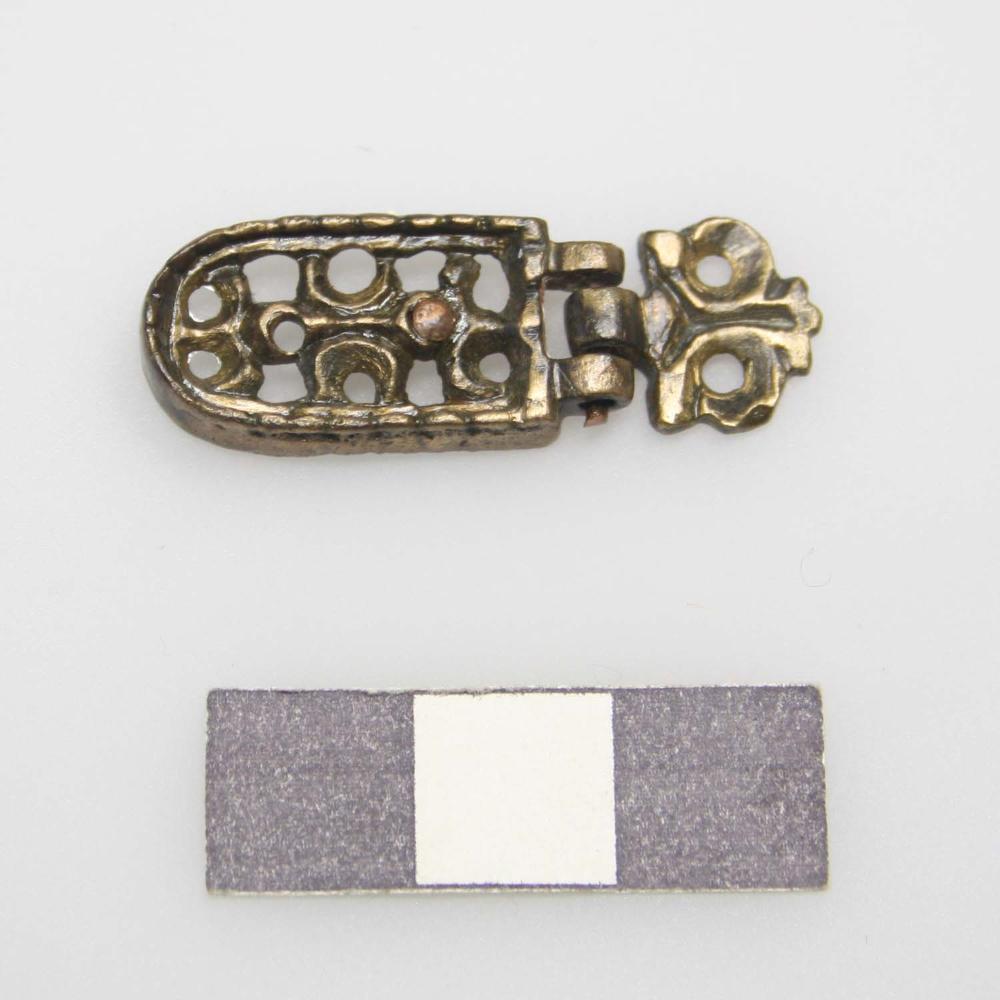 Zungenförmiger Scharnierbeschlag mit Anhänger, dekoriert mit stilisierten Ranken, Buntmetallguss; L 3,4, B 1,2-1,3, D 0,3-0,4 cm; Gewicht 2,2-3,2 g, 19018.145.A.2.5 - 11, 13 - 15 zusammen 28,2 g.
