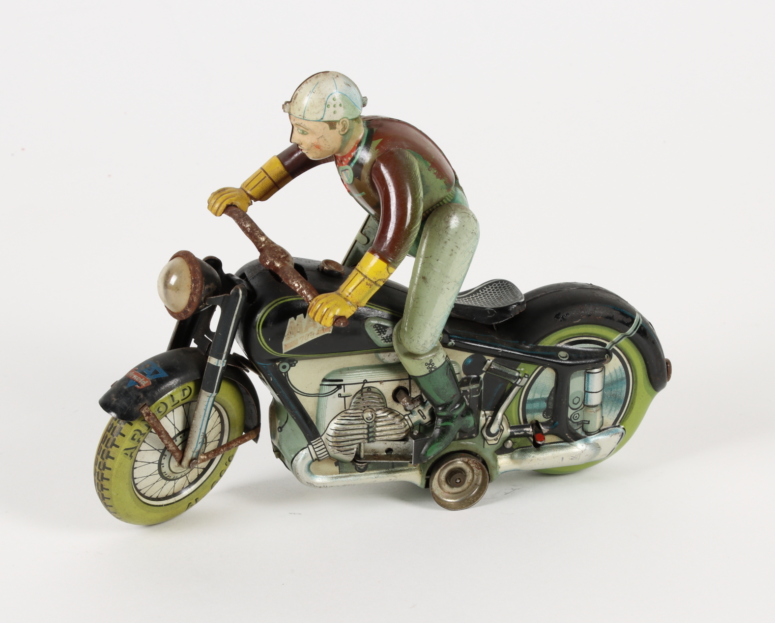 Motorradfahrer MAC 700 mit Uhrwerkantrieb. Aufgezogen fährt MAC Kreise, während der Fahrer auf- und absteigt und dabei sind richtige Motorgeräusche zu hören.