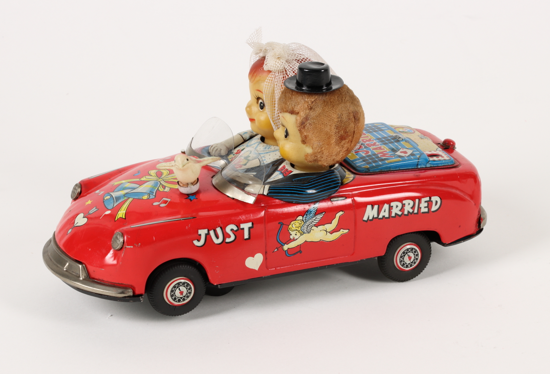 Das Hochzeitspärchen dreht während der Fahrt die Köpfe zu, küsst sich und erfreut sich. Der auf der Motorhaube montierte Vogel zwischert dazu ein fröhliches Hochzeitslied.