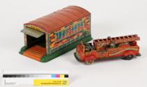 Garage aus Blech mit Telefon, wenn man an der Hörerschnur zieht, öffnen sich die Garagentore.