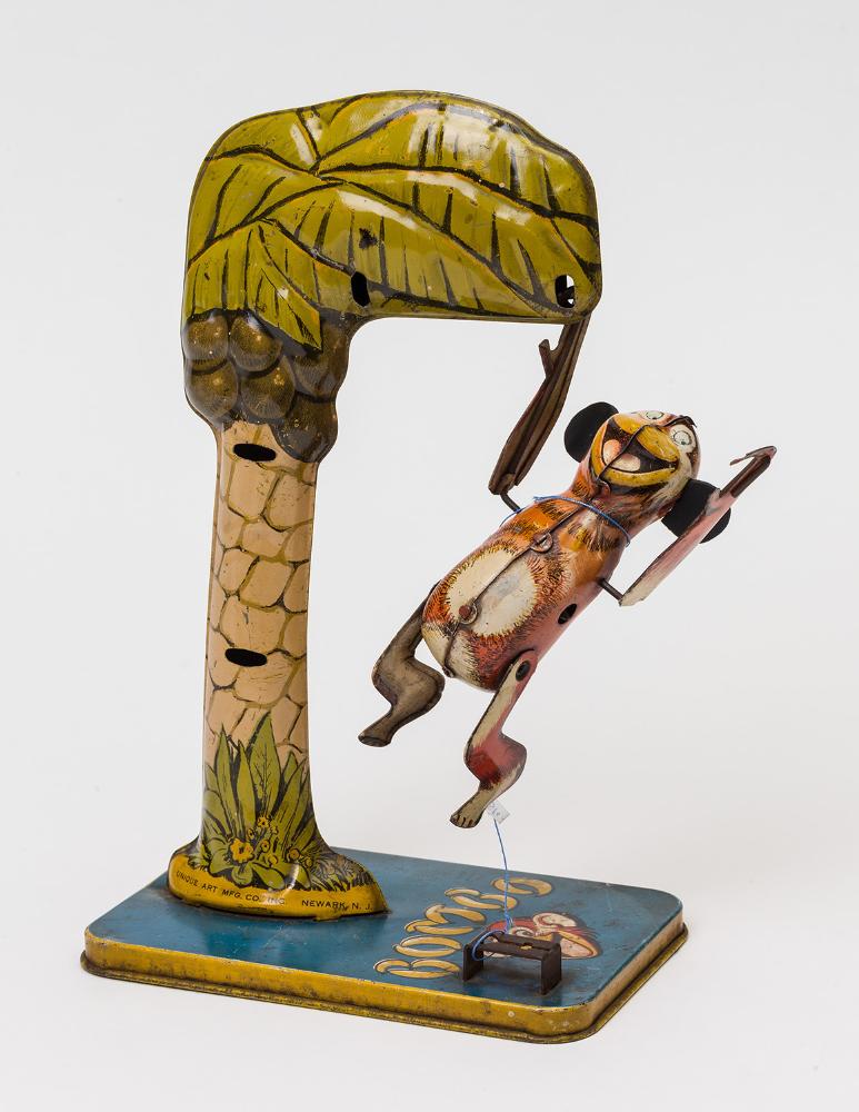 Affe Bombo an einem Baumstamm hängend und sich um die eigene Achse drehend, Uhrwerk