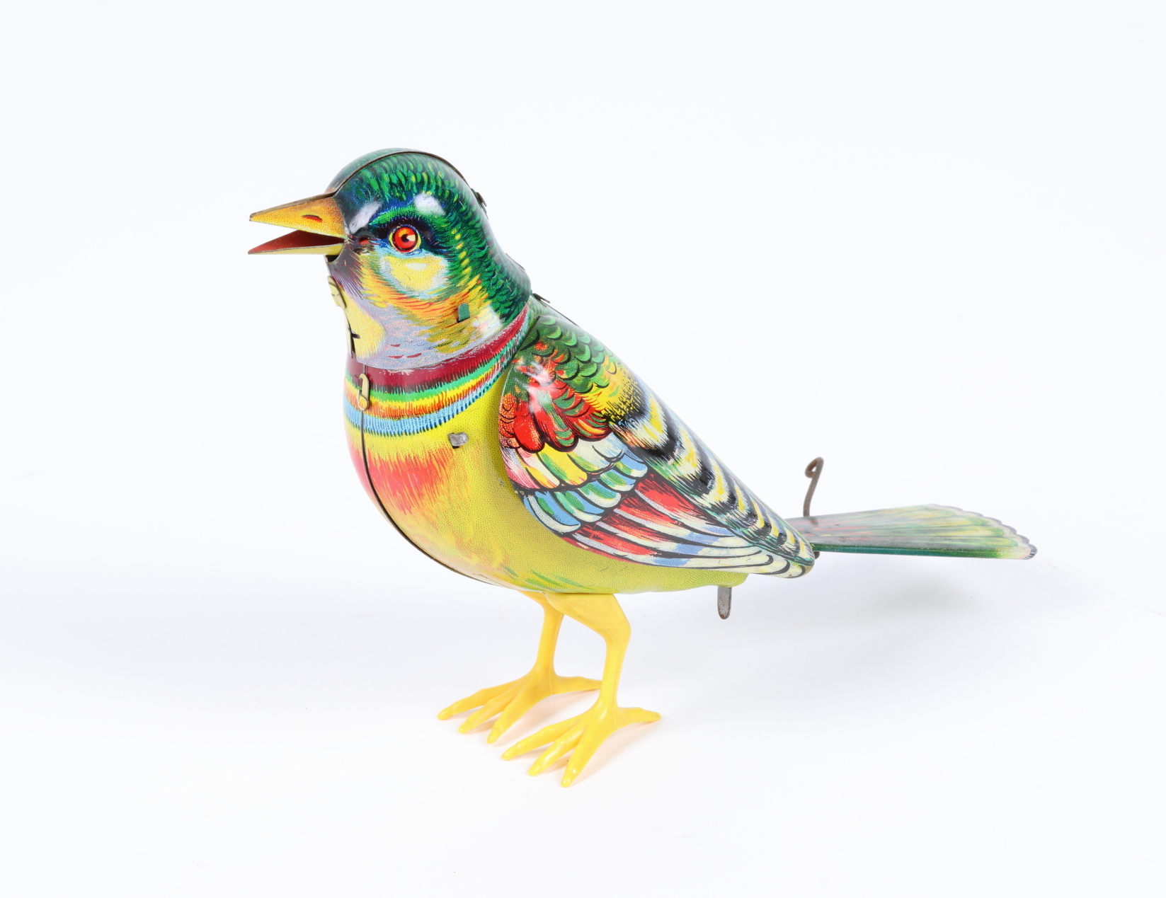 Vogel mit Uhrwerksantrieb mit Start- und Stopp-Hebel, aufgezogen bewegt er die Flügel, pfeift und öffnet und schließt seinen Schnabel