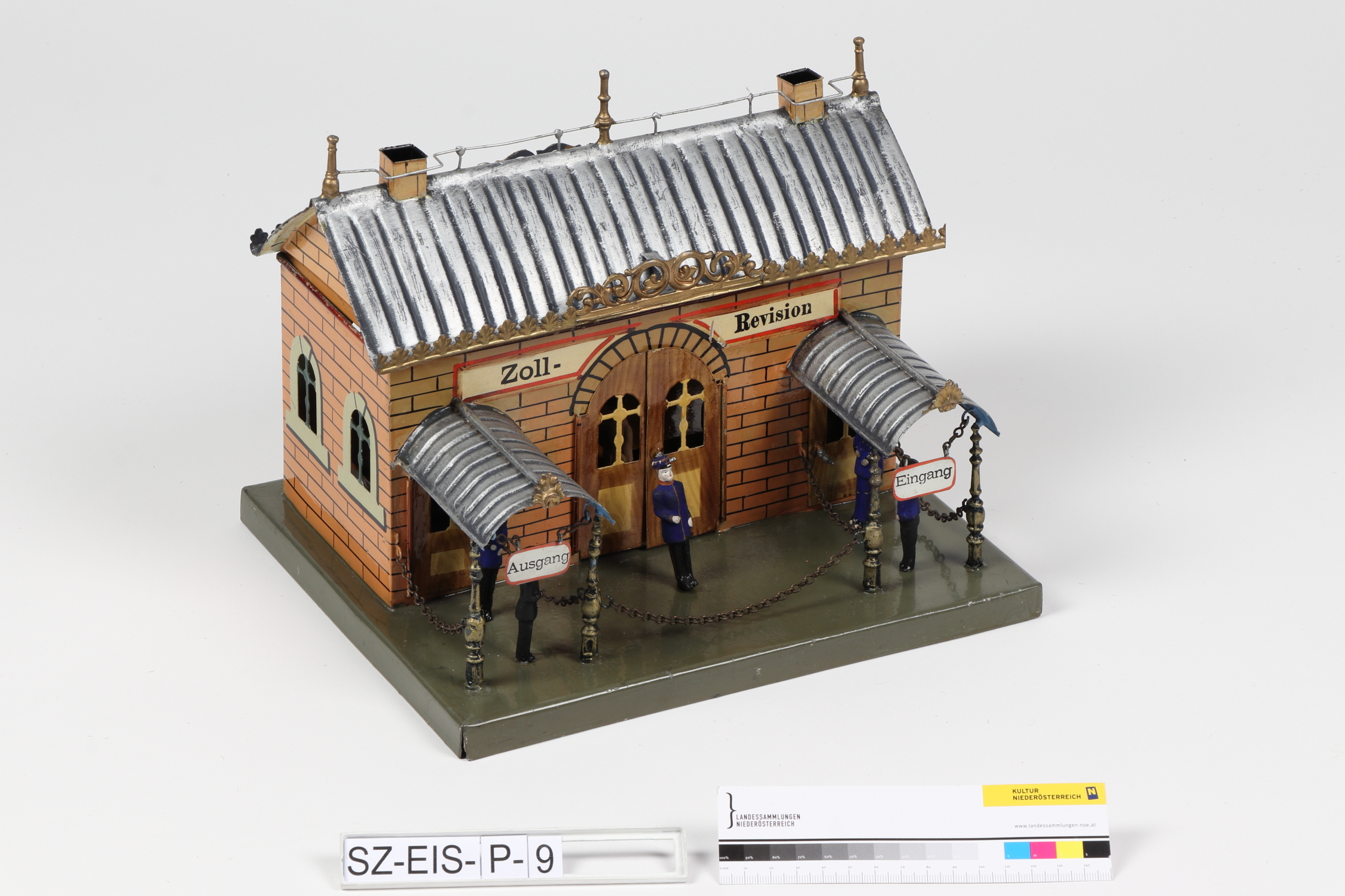 Märklin Zollamtsgebäude mit abnehmbarem Dach und klappbarer Schalterbank sowie einzeln entnehmbaren Figuren in ziviler und uniformierter Kleidung