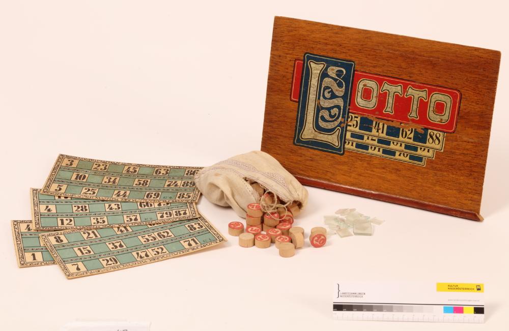 Gesellschaftsspiel "Lottospiel", Originalverpackung aus Holz