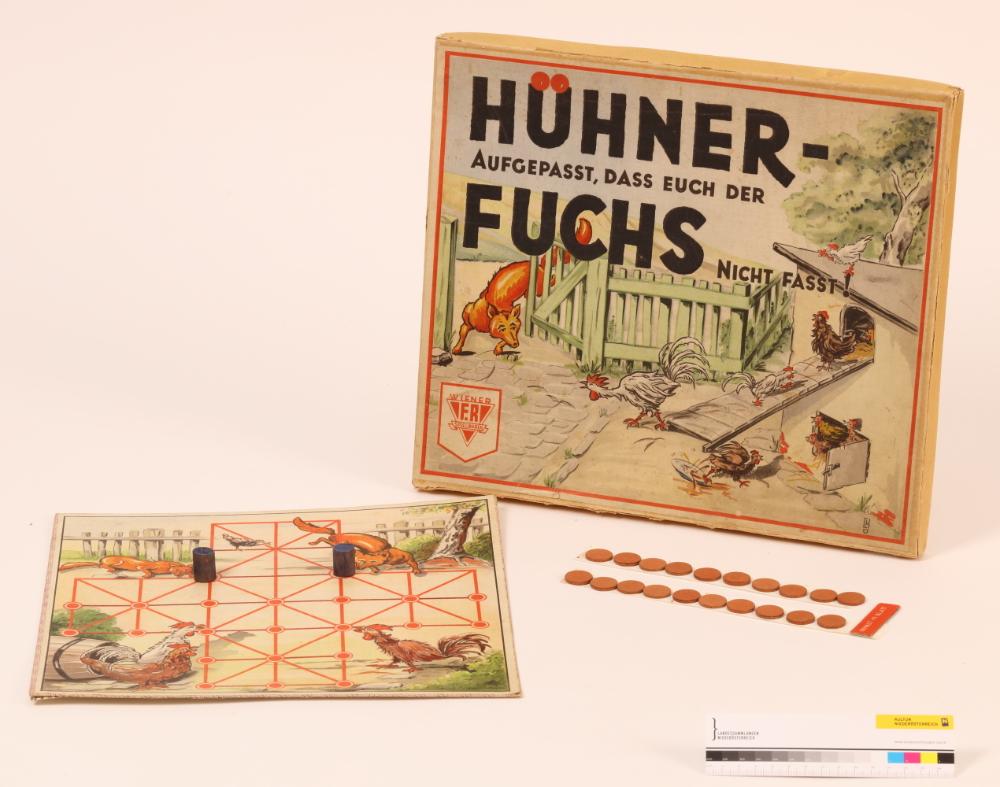 Brettspiel „Hühner aufgepaßt, daß Euch der Fuchs nicht faßt“, Originalverpackung, Fa. Wiener Spielwaren F.R. Rosenberger Friedrich