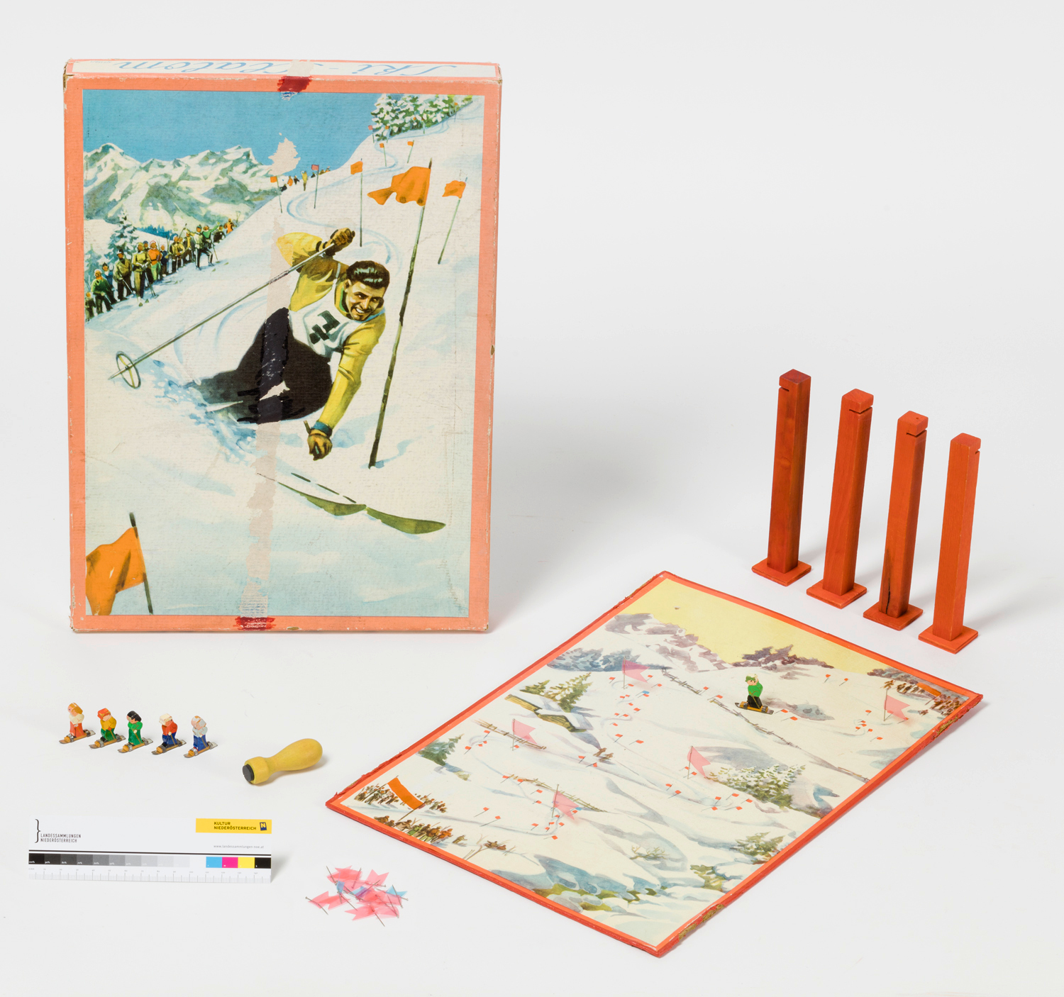 Brettspiel "Ski-Slalom", Originalverpackung, mit einem Spielfeld, 4 Holzbalken, 6 Spielfiguren, Magnet und Slalomfähnchen