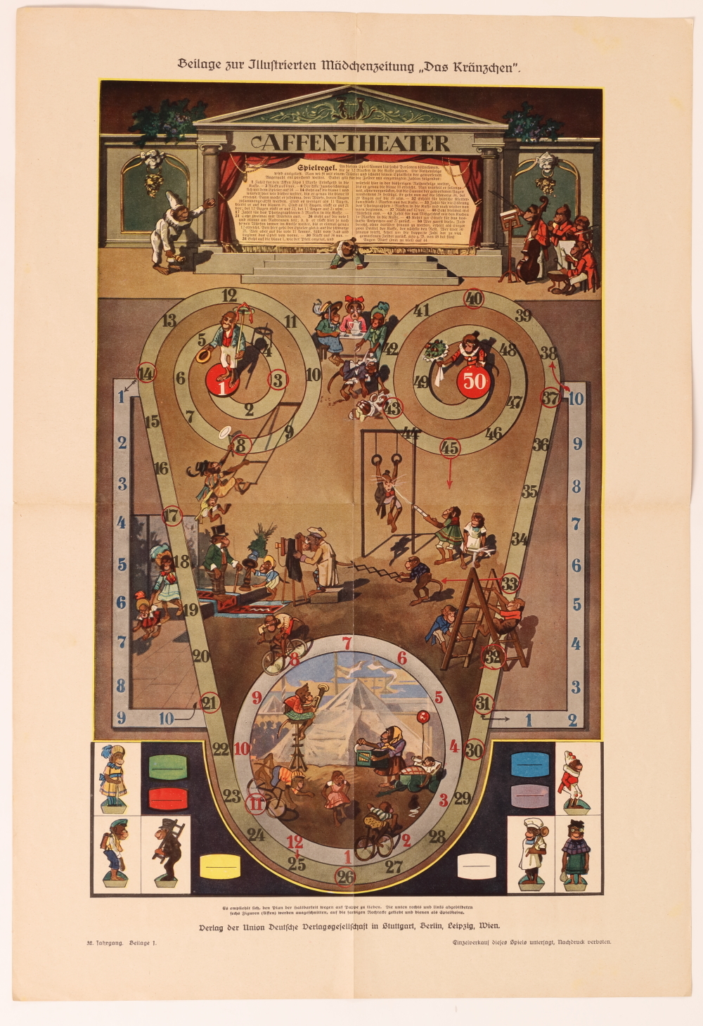 Spielbrett aus Zeitschrift, Beilage zur Mädchenzeitschrift „Das Kränzchen“, "Affentheater"