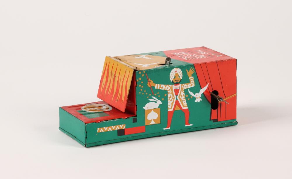 Nach dem Einlegen einer Münze wird mit einem Herbel das aufziehbare Federwerk aktiviert und eine Zauberhand schnappt sich die Münze und schiebt diese in den Zauberkasten hinein.